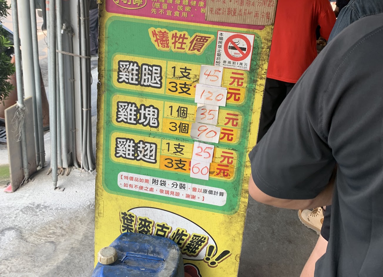 下午14:30開始營業,大約14:45到前面就已經一條人龍了,真的排到大概25分鐘。排名第一好吃的是雞腱(25元/4粒);雞腿(45元偏貴,但3隻120元)的確有中藥味、咬下去有汁,第二好吃?;鹹酥雞(小份50元)聞起來很香,肉質不柴,但入口少了點香味有點可惜;地瓜(小份30元)很甜,不知道是否油溫不夠,放冷後皮會跑出油味;花枝丸就….表現普通。綜合評價,如果住在附近可以來買,但是要排隊25分鐘的話就……也許可以下次再來。