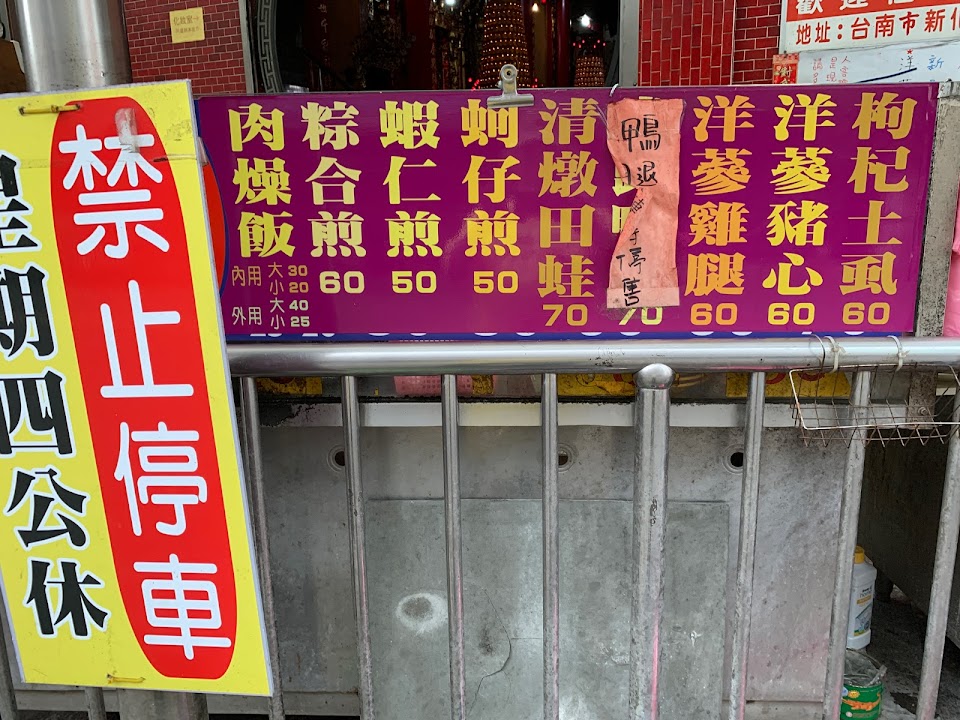 新化老街廟邊的清燉青蛙與洋參雞腿都好吃 雞腿咬既入口 湯頭也好喝 土虱也很棒 還有蝦仁煎等煎類 也有肉燥飯等 也有當歸鴨腿新餐單出來 幾個大姐老板幫忙出菜 沒幾張座位區 也是老店開了很久 它們燉品湯湯都好吃很棒!有經過新化老街可以去逛逛吃吃!