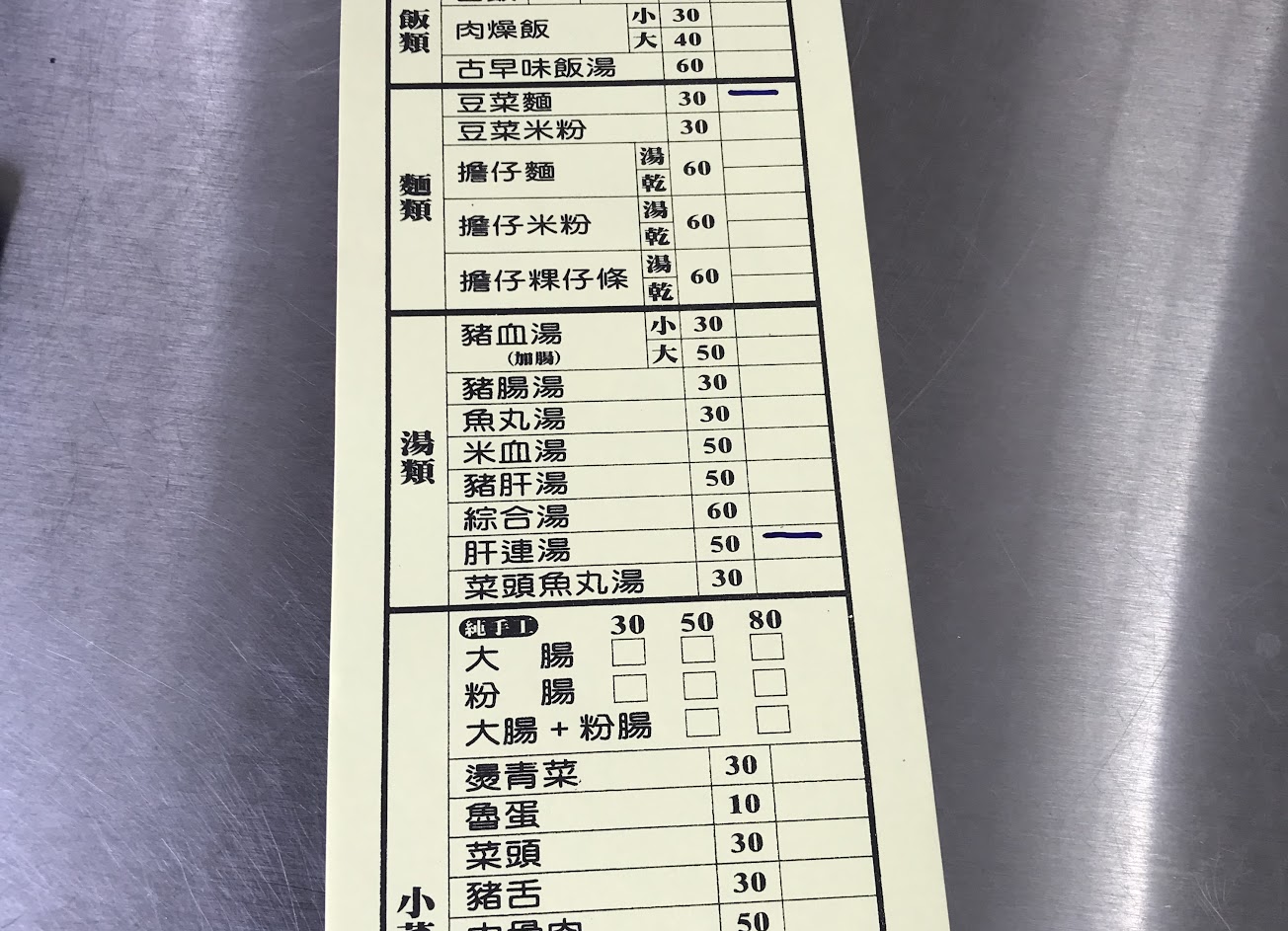 最新菜單價位!招牌豆菜麵為油麵加韭菜豆芽菜肉燥跟花枝或豬肝(老闆隨性),有加點肉湯吃起來不會太乾,厲害的肝連湯,肝連大概有10塊左右,有加薑絲酸菜湯頭好喝清爽!CP值高