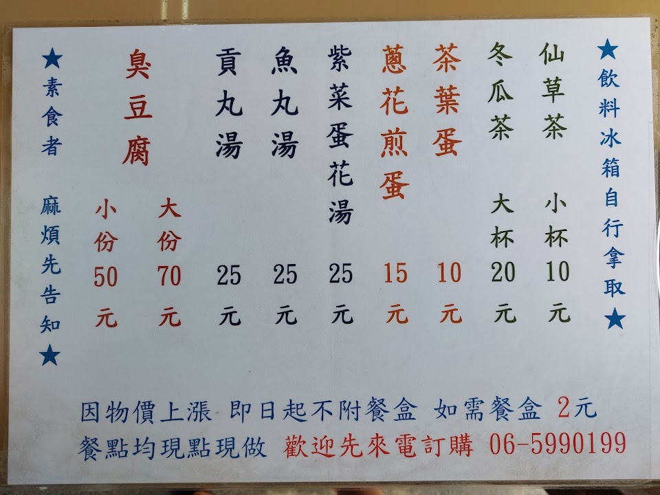 ?臭豆腐是嫩滑順口的口感,與一般臭豆腐口感不一樣。 搭配上特製的泡菜,就是美味加分….. 一定要喝杯『仙草茶』(小杯10元、大杯20元)古早味,好喝。 服務 內用 餐點類型 午餐 平均每人消費金額 $1-200 建議的餐點