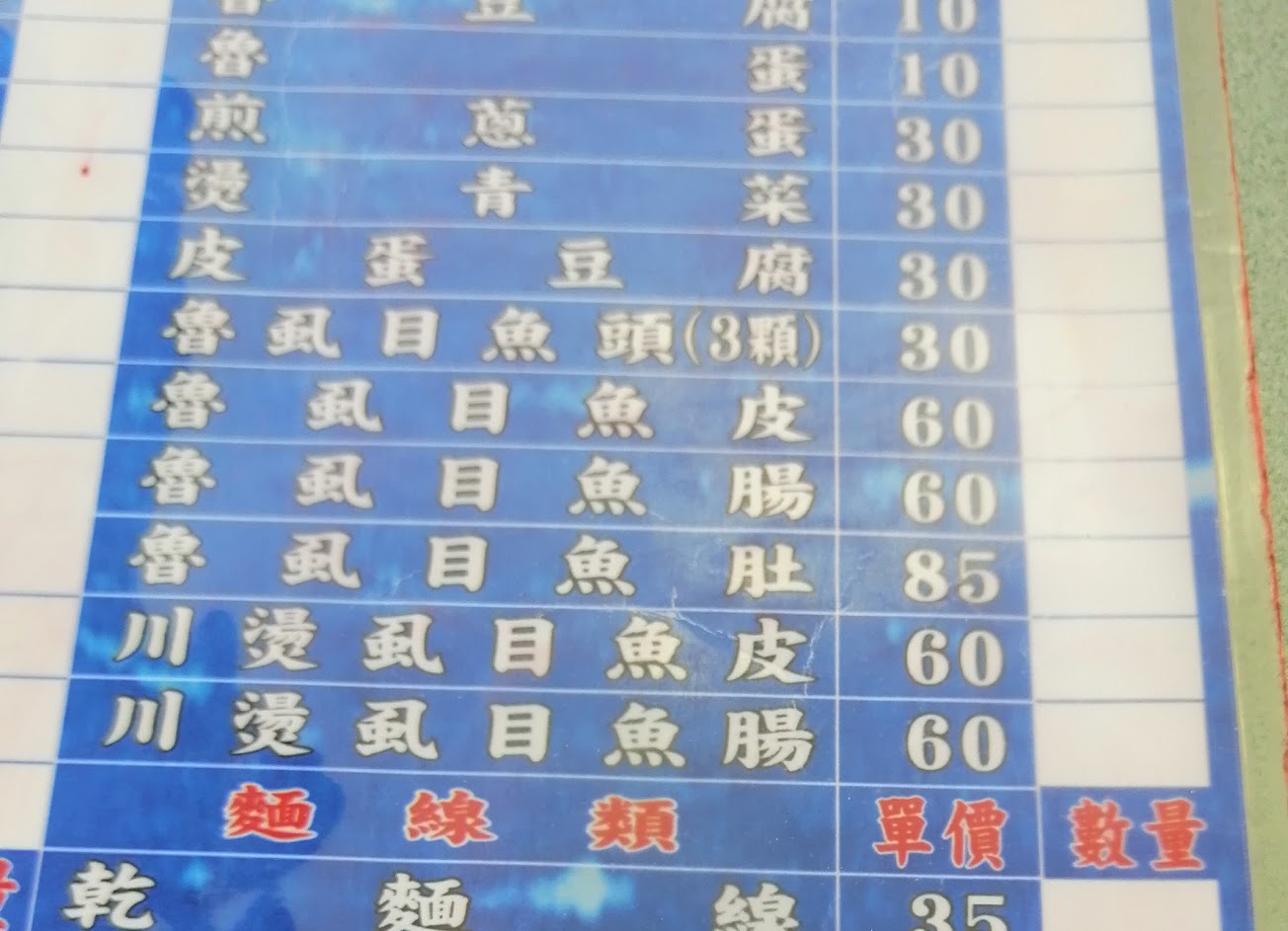菜單上的選項很多,一時之間看得眼花繚亂。點了魚酥肉燥飯、虱目魚皮湯、香煎虱目魚肚、煎蔥蛋、燙青菜、皮蛋豆腐還有一碗乾麵線。