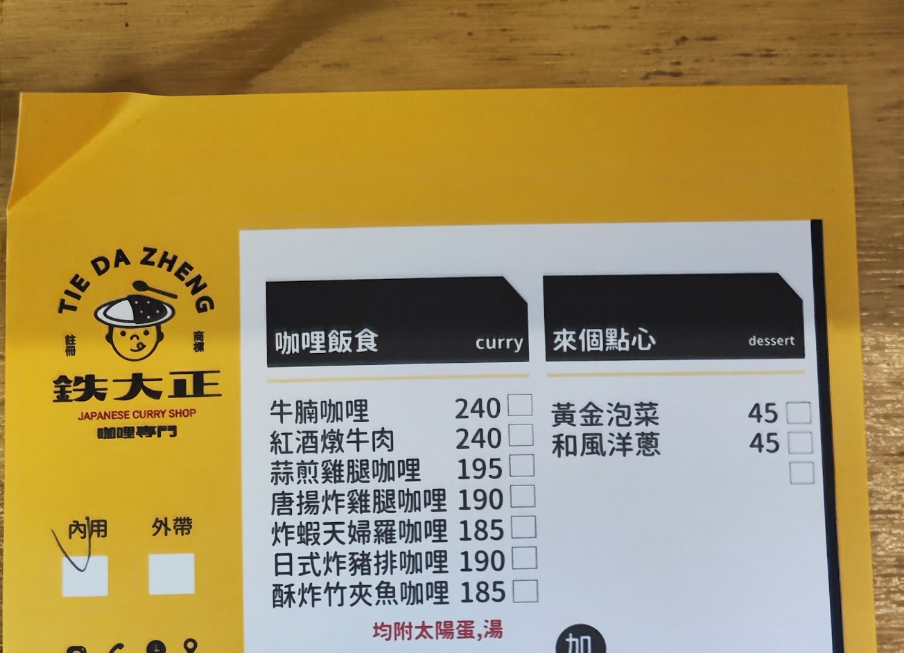 店門前停機車方便。第一次前來用餐,內用環境非常整潔舒服,裝潢偏日式以木桌椅組合,很放鬆。看到留言常常有人提到內用很熱,這次去內用人比較少,冷氣還算可以接受,不過由於開放式廚房沒有做冷熱隔離,所以當人多廚房忙到時候,內用溫度真的會有點小熱,這一點可以在改善一下。餐點擺盤精緻,炸物是真的很酥脆的,口味濃郁,算是蠻不錯的咖哩料理店。價格部分有點小貴,湯品小菜等等都需要額外加點,太陽蛋主餐都有付,可以甭額外加點了。