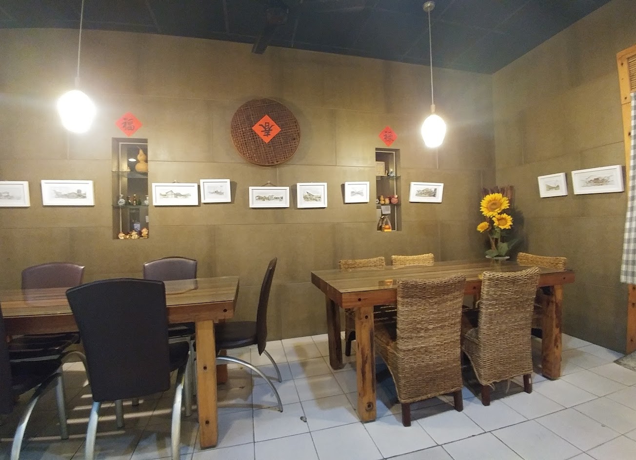 店裡有不少的手繪圖畫,麵的湯頭不錯。桌子也很特別,是用一根根尺寸約十公分的長木組合而成。