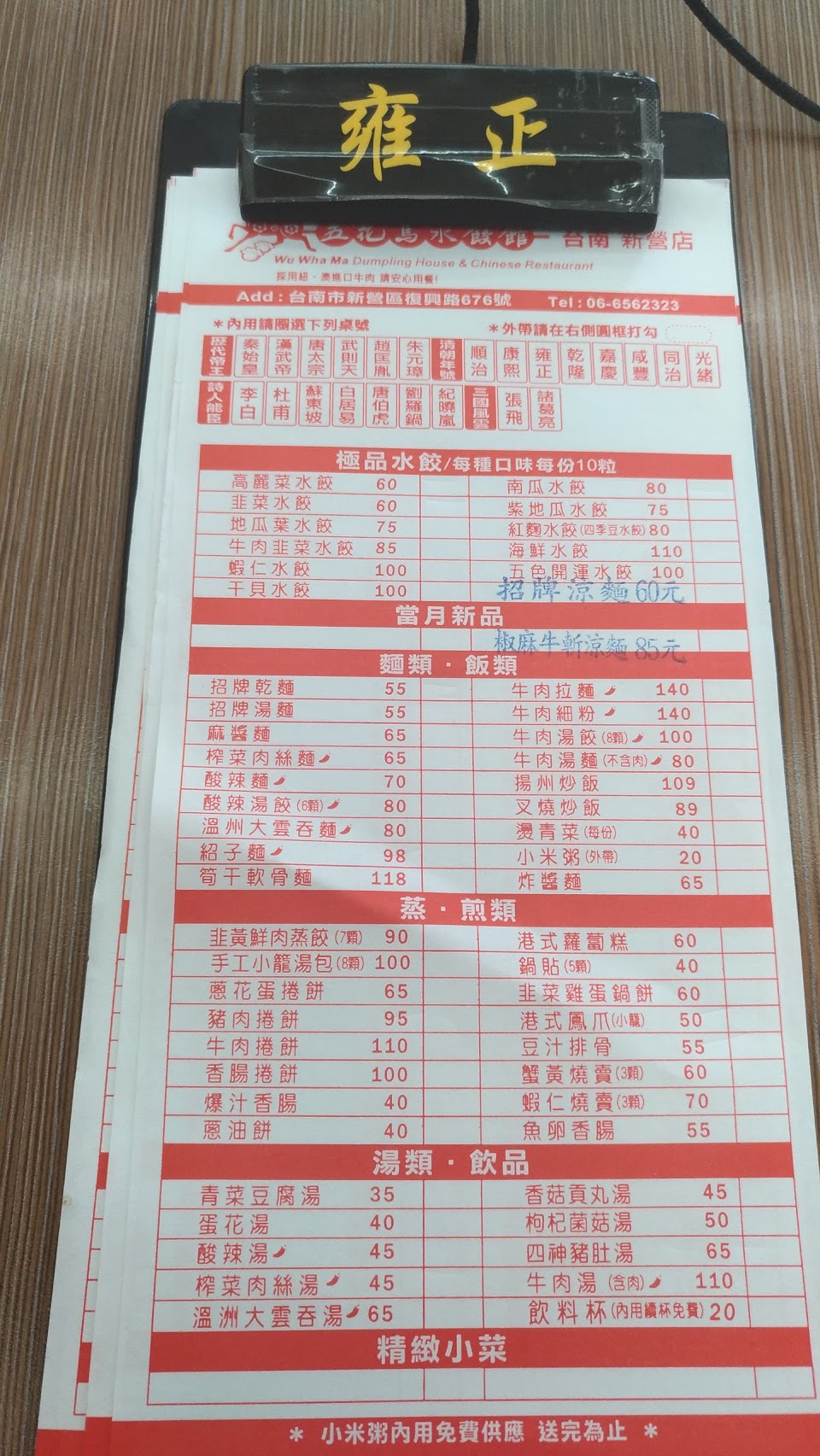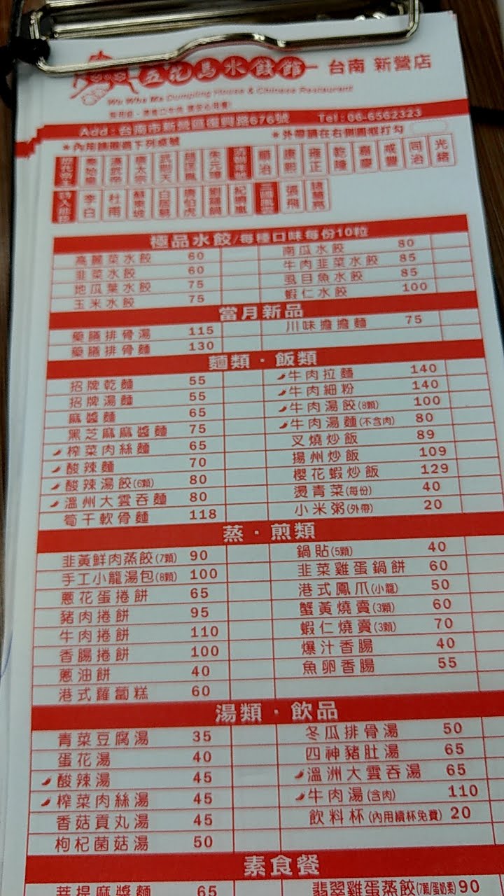 麵類 ,飯類,蒸,煎類,湯類,飲品,素食餐及小菜等,可以多重選擇参考,個人點黑芝麻麻醬麵,麵體Q芝麻醬香氣足,再配虱目魚水餃,魚肉鮮甜無腥味很棒,來個酸辣湯湯頭口感適中,消費尚可合理推薦來此用餐? …
