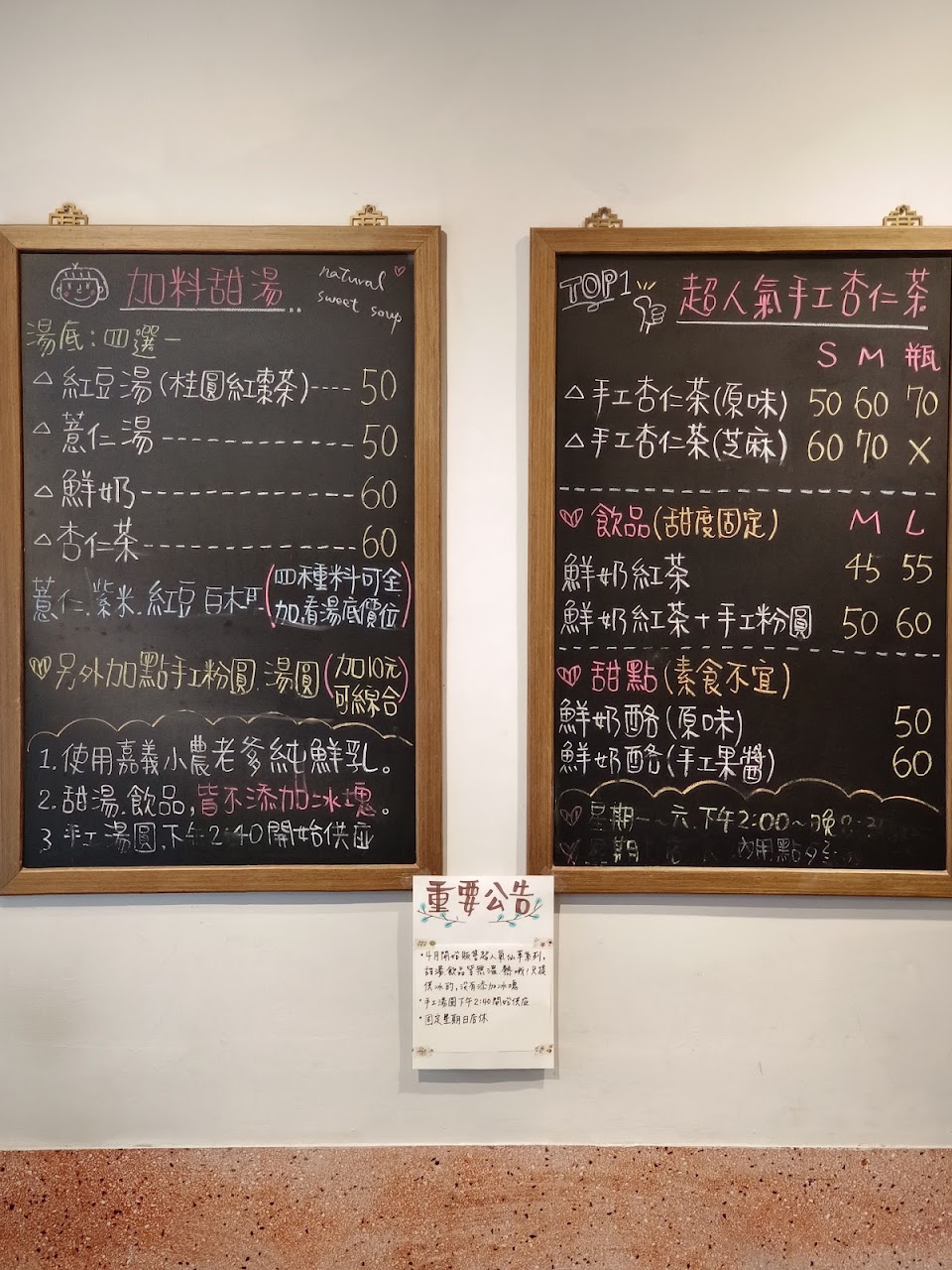 杏仁茶香濃可口,喝起來真的有幸福的感覺。紅豆湯加了桂圓和紅棗,多層次的口感,令人回味無窮。老闆和老闆娘都很親切,甜湯的價格又非常公道,是一家想令人一訪再訪的溫馨小店。