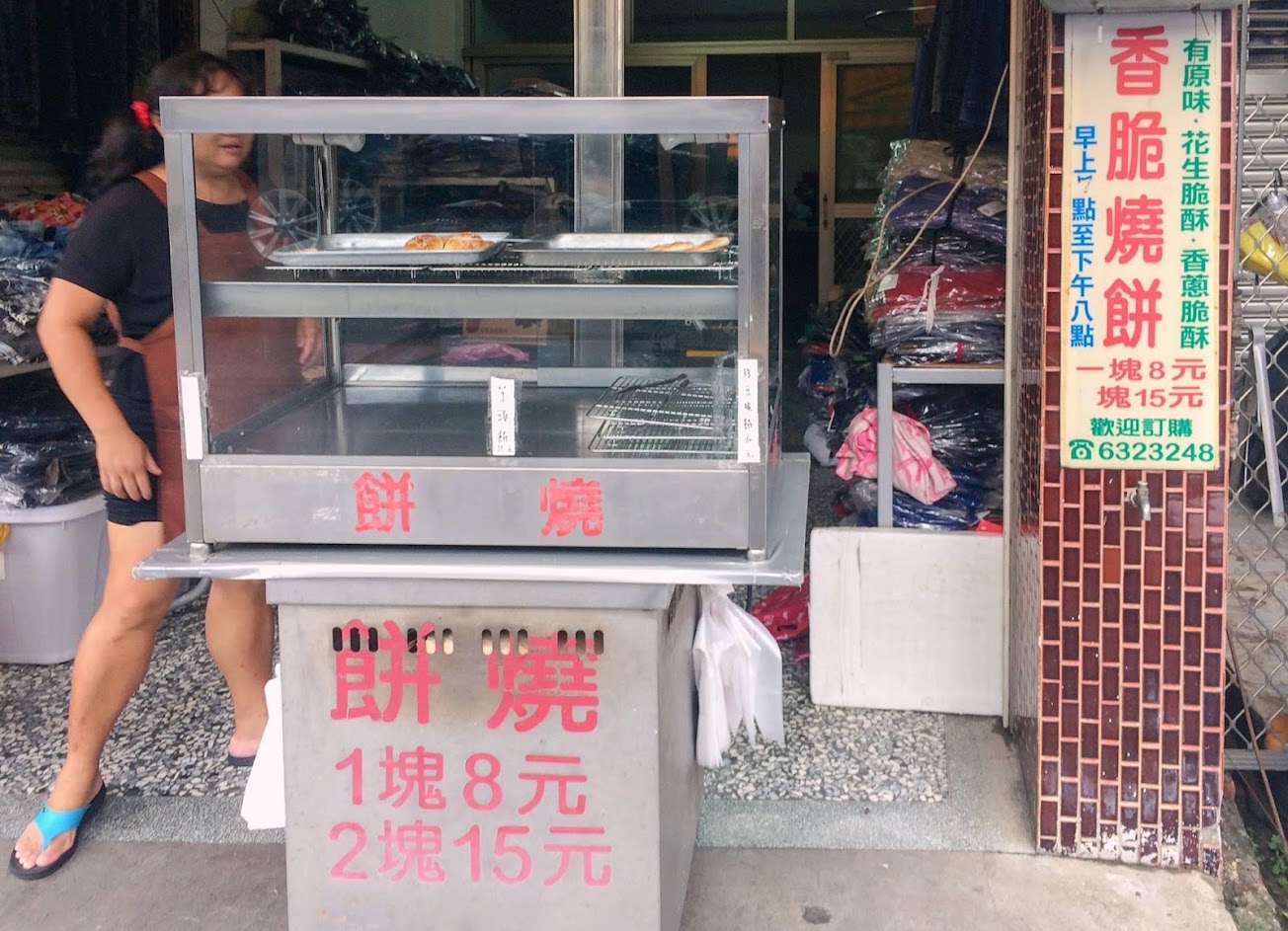 位於新營三興街上,這家外頭賣衣服的店家,其實內藏玄機,工廠就在住家後頭。早期夫妻烘焙麵包,供應給新營地區中學內的福利社做販售,六七年級生或許都吃過。近年,飲食習慣改變,便利商店林立,麵包已經不再是福利社銷量的大宗,夫妻倆進而改作燒餅販售,也在這個巷子裏賣了將近十年。