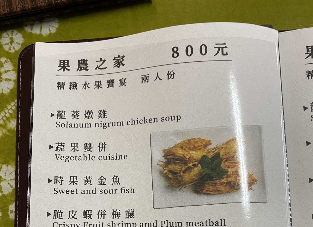 此為$800雙人套餐 水果入菜,創意料理。 口感滋味皆新奇。 水果宴有附白飯。 (脆皮蝦那道菜是香蕉裹上地瓜絲炸至酥脆,我想應該是指外型有點像蝦吧….)