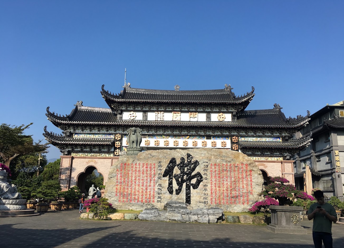 很厲害的庭園造景,裡面有很厲害的巨石,有些看似是鐘乳石,有些石頭內貝殼的化石。還有很像殺戮都市(Gentz)中的黑球,還有巨大的神像不禁讓我想起電影中的情節。還看到法寺中的師父在進行修繕真是厲害,跟其他寺廟外包的不一樣。寺廟中的水池內還有很多巨大的鯉魚,長的高達1公尺但是全身都黑色的,小隻才有其他顏色,感覺很像長大後就會全身黑化。裡面還有很多,跟人一樣大小的神像,下面刻著天龍八部的X部X神,數量很多不知道有沒有全部都有,最近疫情關係很好停車喔!