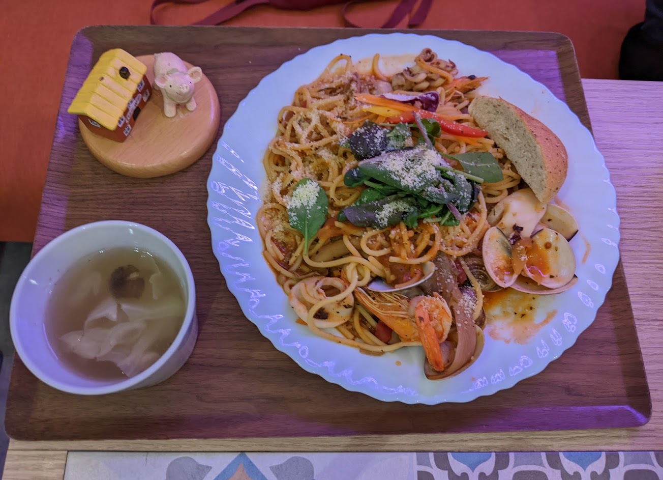 海鮮紅醬義大利麵$300有湯,飲品,打卡送的甜不辣也好吃。親子友善。