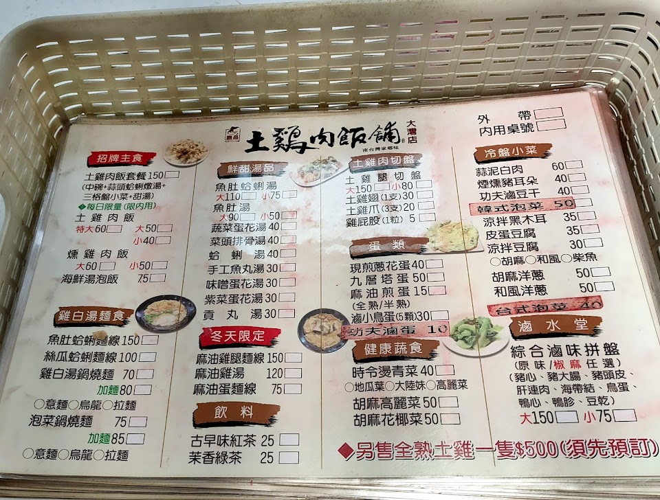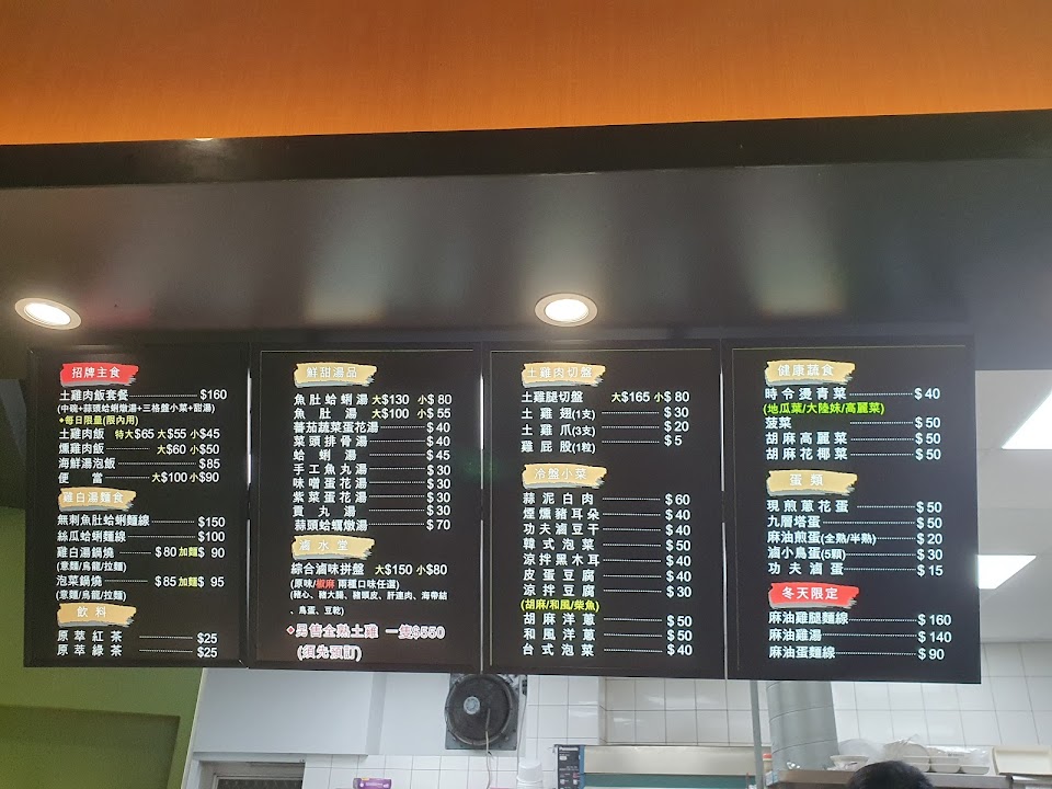 有賣土雞肉飯跟燻雞肉飯及麵類、湯品、各式各樣小菜