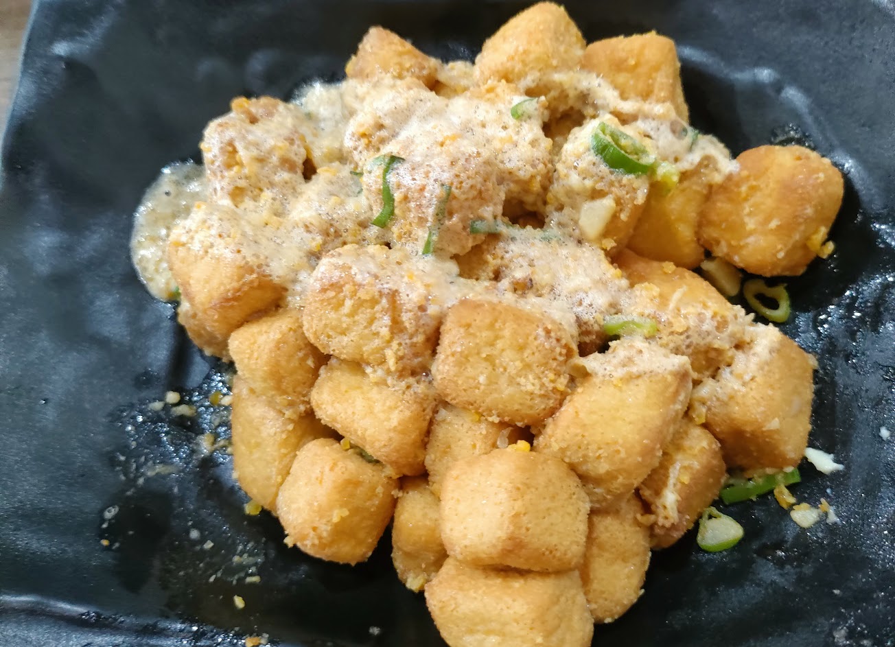 金沙豆腐-豆腐處理的很好,外皮帶些韌度裹上鹹蛋黃,內部依然柔嫩,孩子非常喜歡