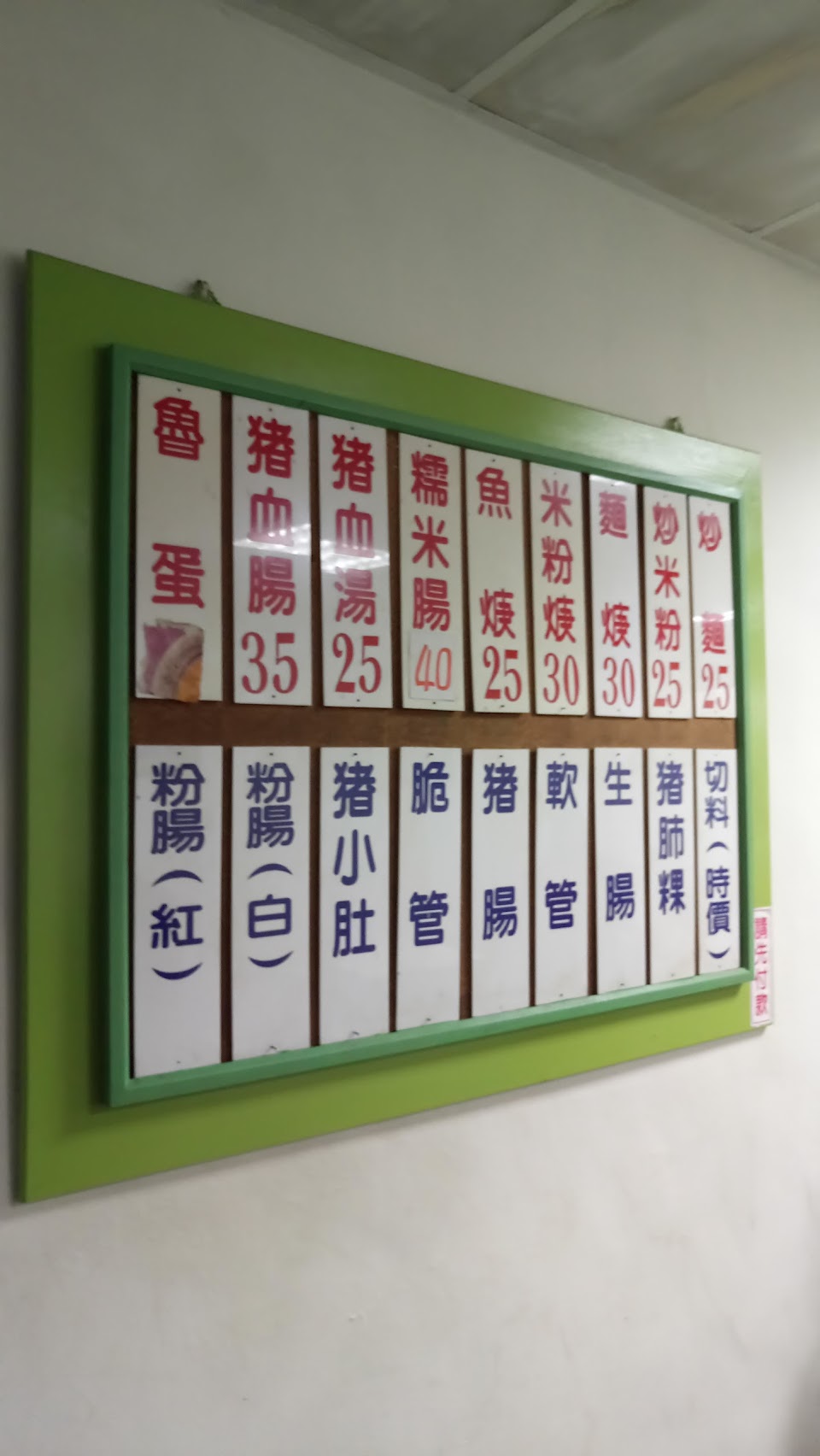 中午11點半左右的時候來的,外面排隊已經大排長龍了,點了豬血湯、豬血腸(豬血湯加小腸)、炒麵、另外還跟店家切了100元的綜合小菜。