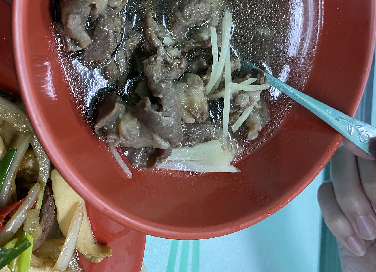 肉燥飯20元吃到飽真的很划算,牛肉湯和炒牛雜也是在水準之上,但有件事讓我覺得很傻眼,去跟掌廚的要隻湯匙對方二話不說叫我自己拿,順手拿了湯匙回餐桌上被打掃阿姨罵,說怎麼不拿免洗塑膠白色湯匙,我在內用你拿上來的也是一般湯匙,那請問我是這樣有問題嗎?