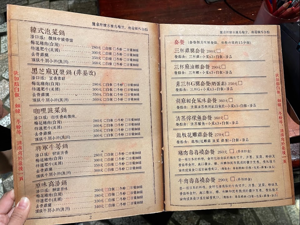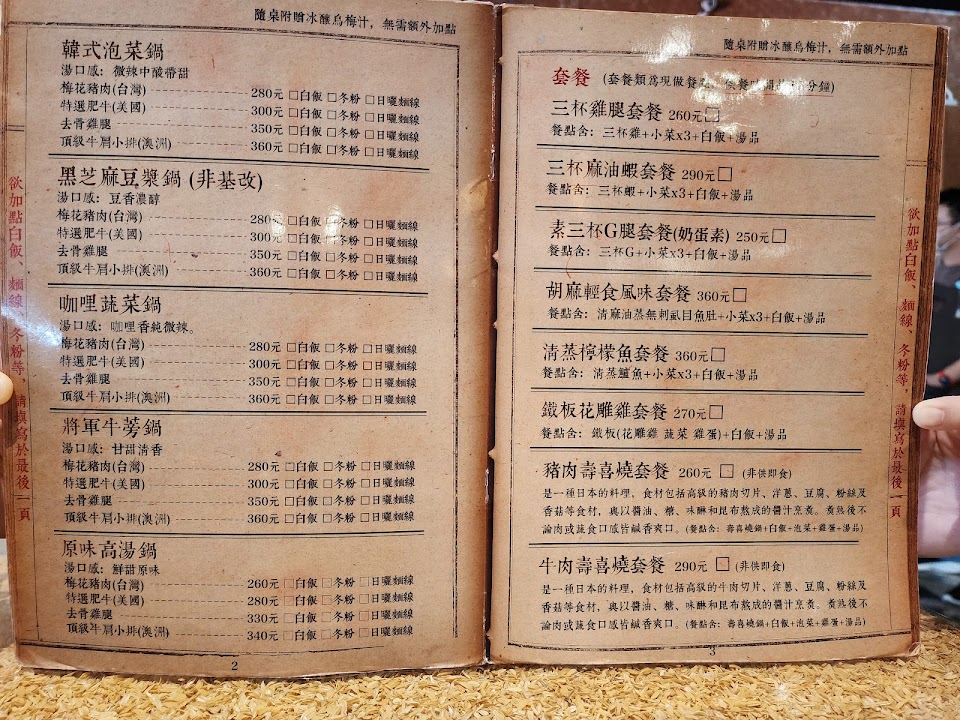 13:20到 不給吃鍋了 只能選簡餐 而且跟我強調 14:00要休息了 我回他 我吃很快 20分吃完 就閃人了 下次有機會我會吃到鍋 如果好吃的話 在把星改回五顆 餐點:2 服務:2 氣氛:2