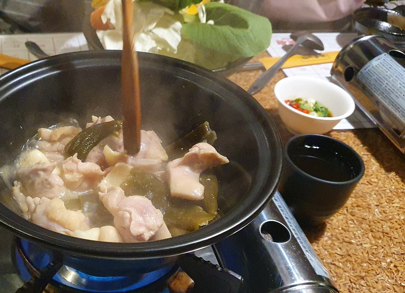服務生會先端上 帶柄的陶鍋 裡面有黑麻油 老薑 新鮮的雞腿肉塊 小火慢煎,可以先吃 幾塊,是為第一吃