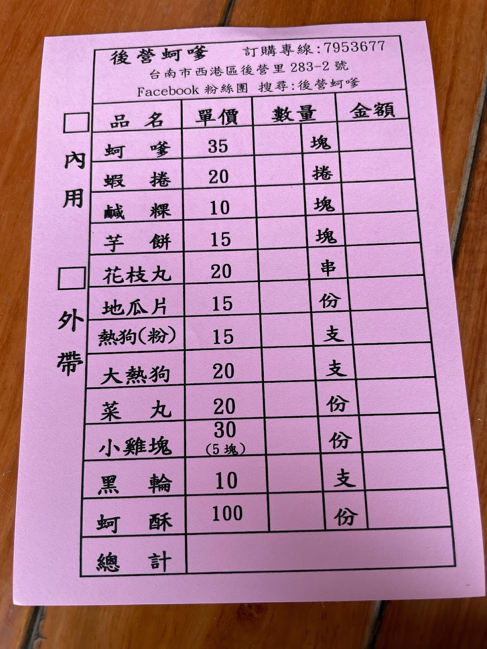 不太好停車,出餐算快,很多人內用 服務 外帶 餐點類型 其他 平均每人消費金額 $1-200 餐點:4 服務:4 氣氛:3 建議的餐點 蚵嗲