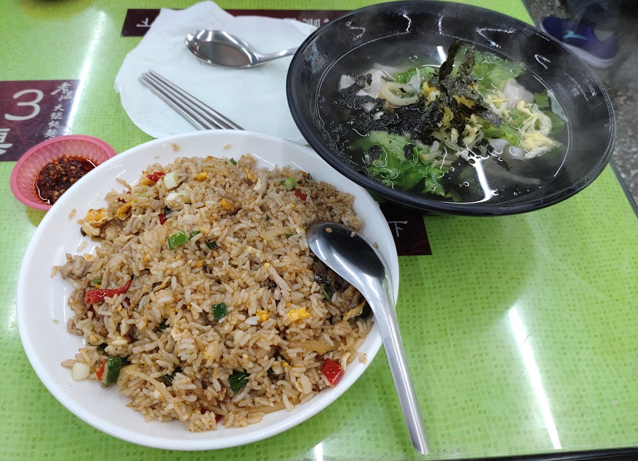 肉絲蛋炒飯大碗的份量就很足夠,基本上不用再加飯,餛飩湯餛飩不錯吃,不過湯頭屬於淡的要再自己加調味料