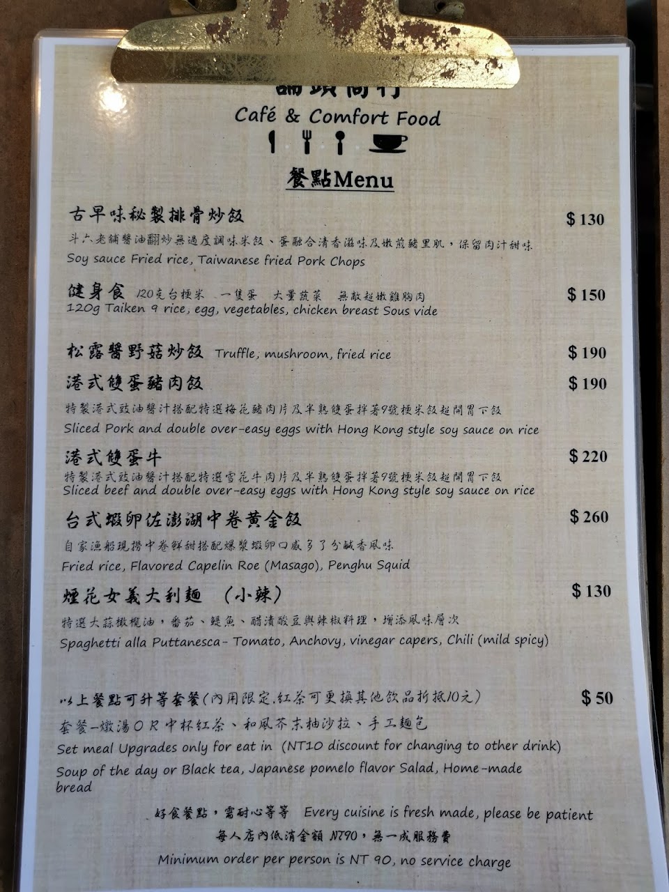 店內每日特別料理會寫在牆上小黑板,當天點了宇宙無敵豆皮義大利麵$160、蔬菜湯$60、松露醬蕈菇義大利麵$230、舒心茶$70。