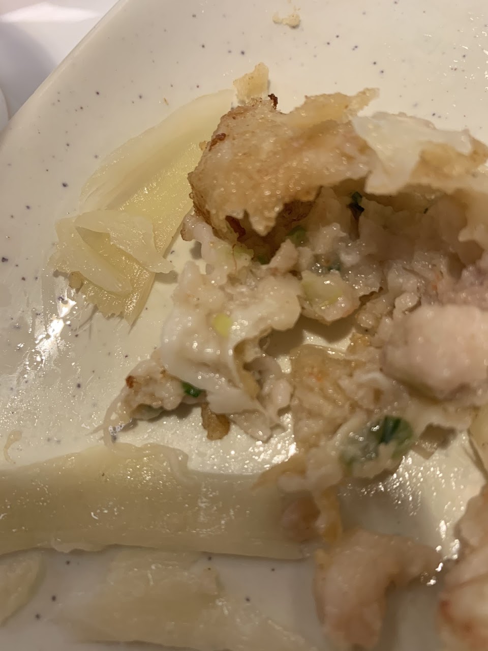 蝦捲沒有熟,還吃到粉漿。豬油網都還在。