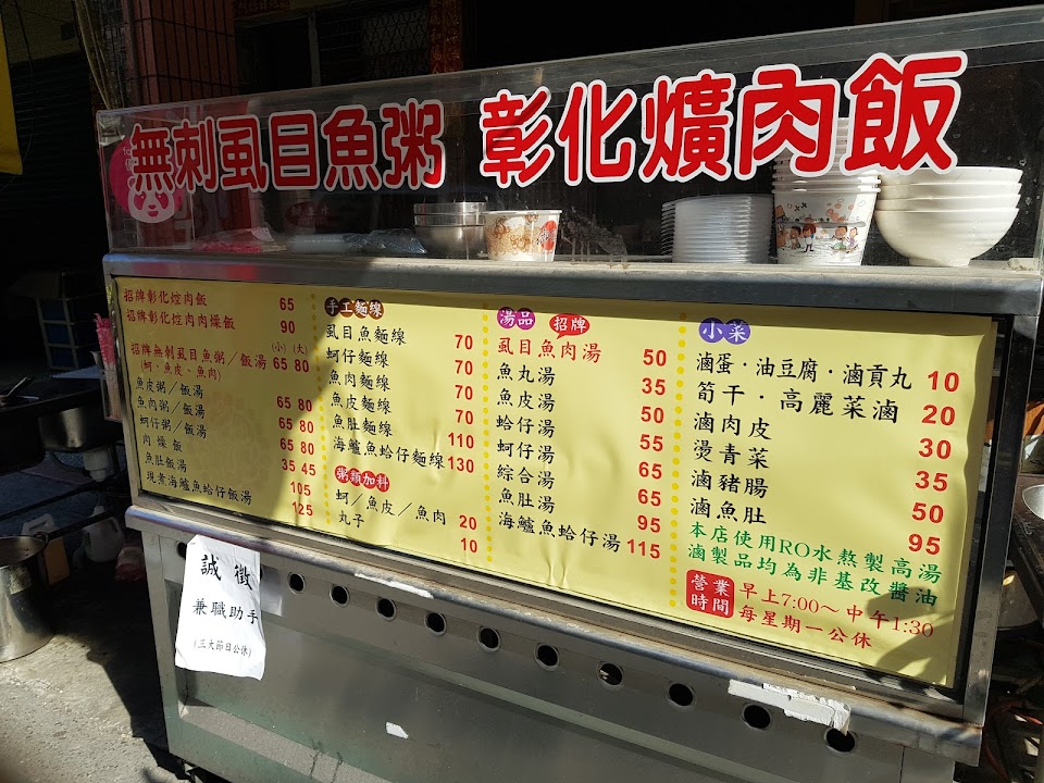 推有控過的湯頭,招牌有大塊魚肉魚皮,蚵仔和魚丸,控肉雖顏色不深很軟爛,可能南部人愛甜,老闆是寫彰化滷肉飯稍偏鹹,35元的燙青菜新鮮又多,老闆手腳俐落,店內乾淨,賣早市時間,吃完胃暖暖很舒服,超推