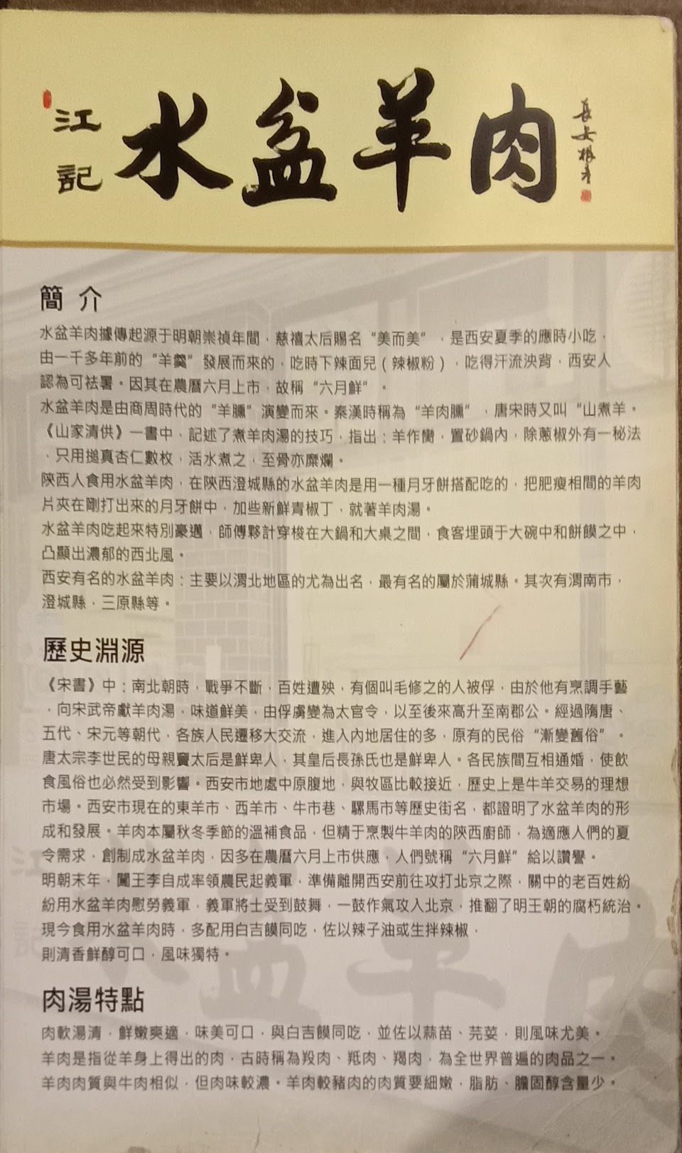 下午1點,店裏沒有人,看了一回菜譜,點了一碗它們的招牌「水盆羊肉」,配上的麵是岐山麵,就是我們常吃哨子面的麵條。跟台灣的台南關廟麵口感相似。