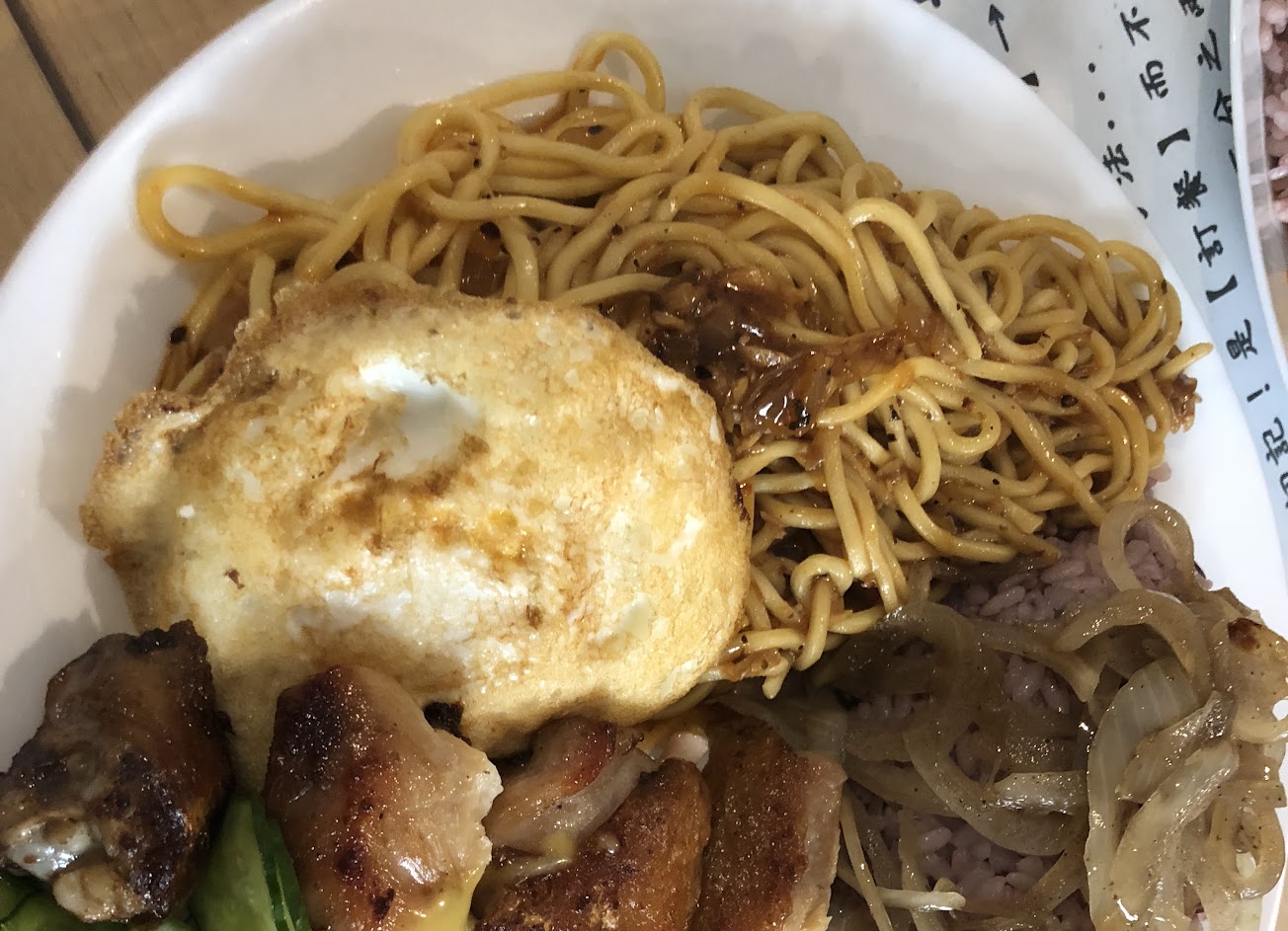 雞排好吃外皮很酥 紫米飯有點硬偏乾 麵的醬好吃 甜甜的