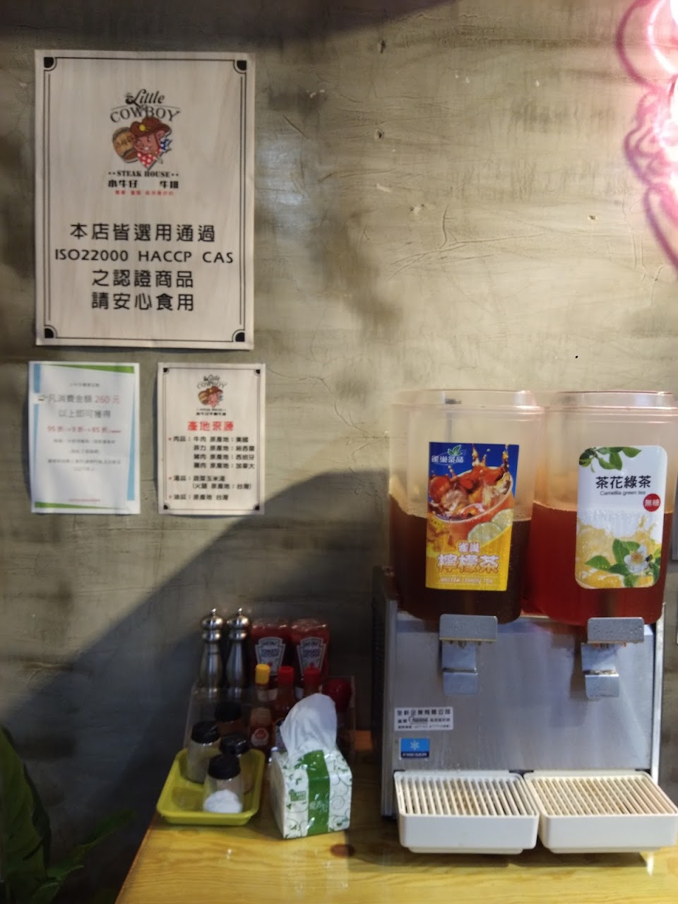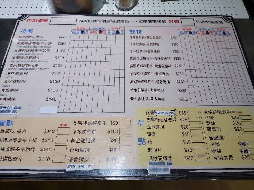 沒有發票,不提供WiFi,飲料已經臭酸,單點排餐肉少無麵,等於強迫顧客點套餐,桌面醬料乾硬擠不出來,外帶還要加收費用,這個價位我可以去吃其它更優質的平價牛排店。