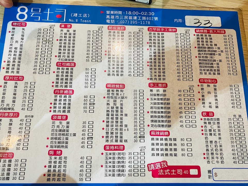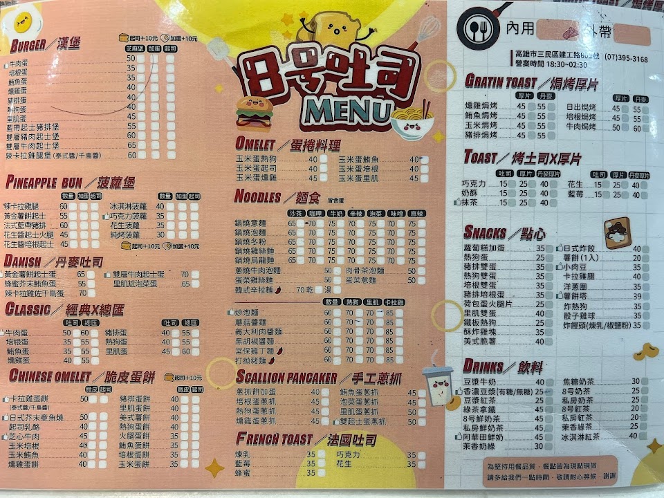 2024最新在地推薦餐廳的菜單_8号土司 No.8 toast-建工店的菜單、圖片