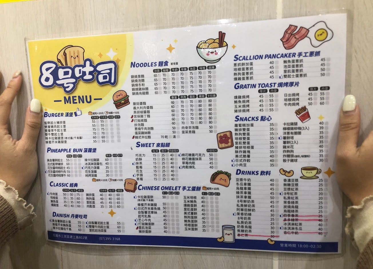 餐點價格不貴,就像是有裝潢的早餐店,這次等待約15-20分,聊天的話是還OK的宵夜店~ …