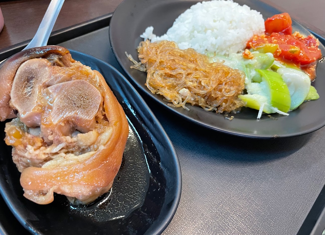 這是一份很容易吃的豬腿便當。店裡沒有冷氣,很熱。