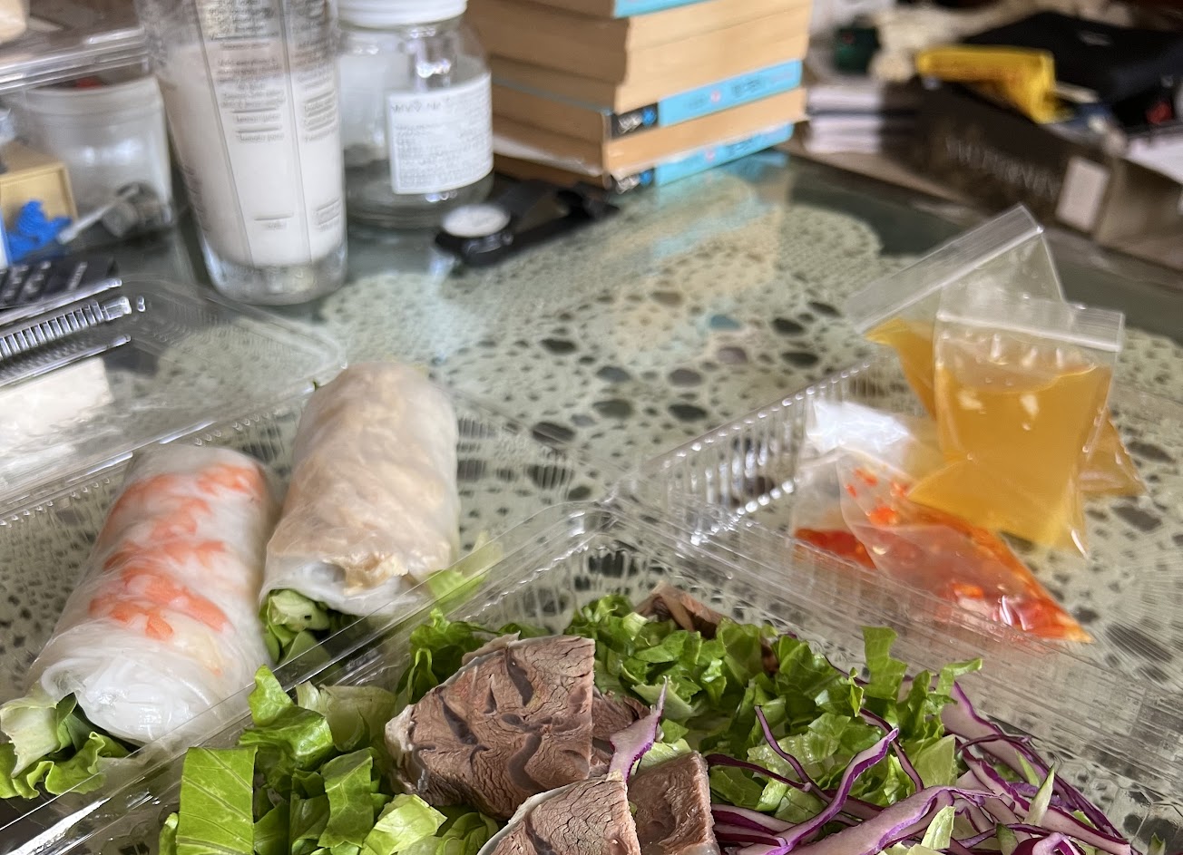 雞肉嫩湯鮮甜、乾河粉也好吃、涼粉春捲有三卷(分別包蝦/火腿/肌肉),每次上班叫熊貓外送包裝都很好!
