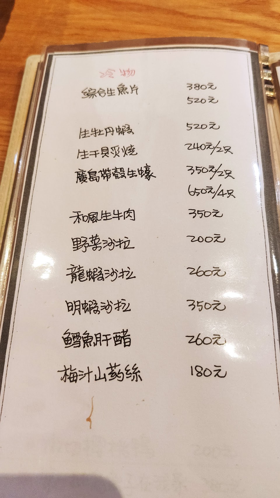 海鮮類的,因為今天只點了炸巨蚵和日本海膽,很新鮮,猜測海鮮類的食材品質很好. 牛肉類吃起來也算好吃,生牛肉似乎甜度不大夠. 豬(有豬臭味)和雞肉的品質可以說有雷到,肉質不鮮甜之外,也沒有肉汁,覺得像是冰凍後有脫水的感覺,無法給過! 蔬菜類的食材都有新鮮,一般料理,好吃. 水酒價格比一般單杯價格貴一點,但份量給到兩倍,對喜歡量多的人來說划算,我個人則是喜歡單杯不用量多,不覺得份量多有什麼吸引力.