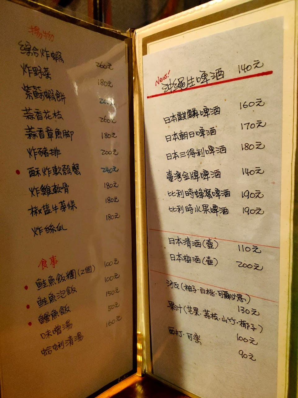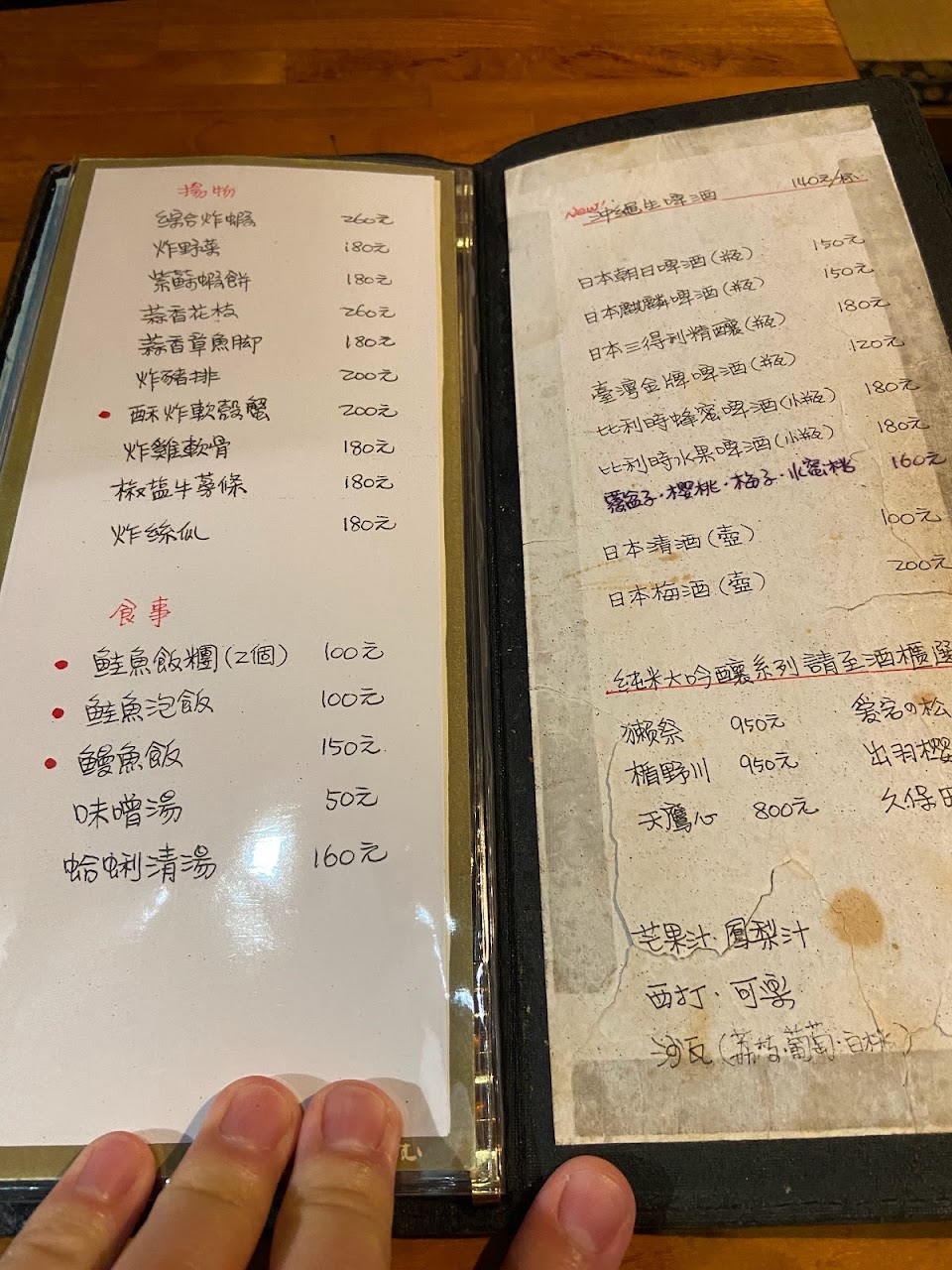 看著看板點了幾道推薦特色菜色,口味少了日料精緻感,有一點失望,炸物如紫蘇蝦餅和蚵味腐皮卷,整體口味較重偏鹹,比較像臺菜的油。而烤物偏鹹,尤其是年糕,上面的味增(應該是?)加上本身的調味,一大杯飲料都不夠解鹹?。可能菜色是為了喝啤酒的配菜? 對於開車者來說沒有適合的居酒屋飲料?,只有果汁和汽水。