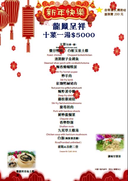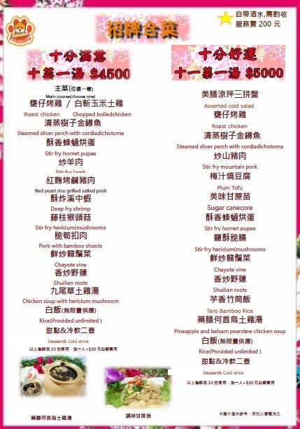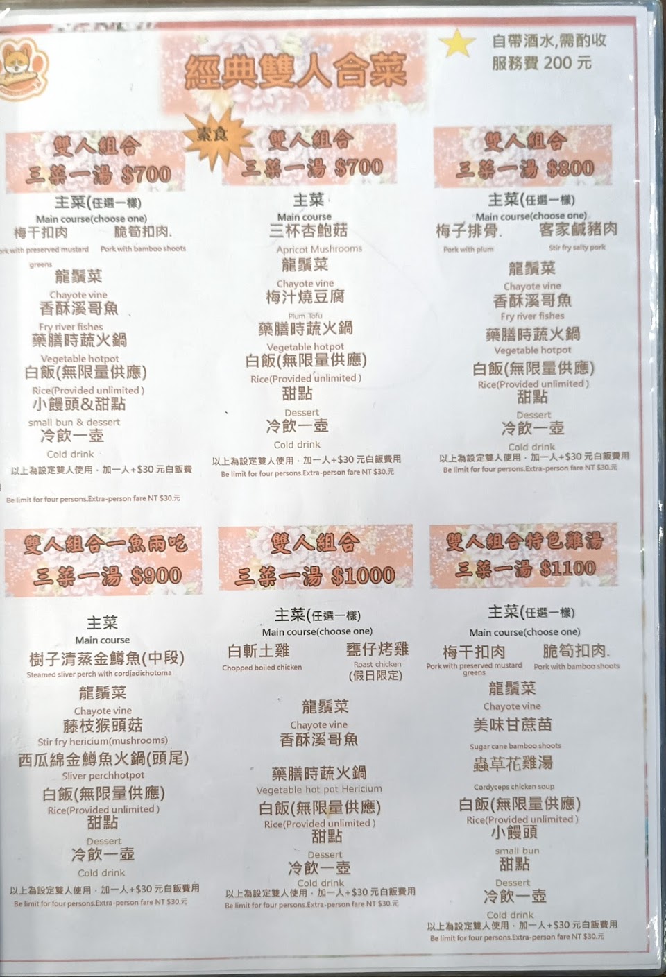 2大2小點一個2人800元合菜,超過合菜人數ㄧ人多收30元(有多2個甜點,沒有服務費)。13:15進來還是有稍等一下才陸續上菜,太忙了要自行留意有無漏上菜。份量2個人吃可以,2大2小建議加點一道菜。餐點口味ok,梅子排骨好吃很下飯(如排骨肉可以嫩一點更好),飲料有點像仙草蜜,可惜沒吃到甕窯雞,建議先電話預訂