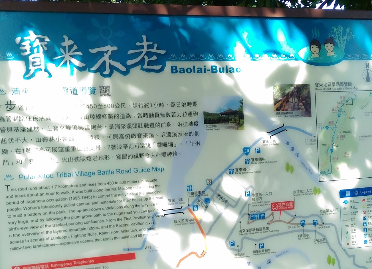 假日在公園入口寶來國中有開放臨時停車場,入口有長又陡的樓梯及斜坡,非常不建議有嬰兒車及長輩前來,公園內只有足湯有開放時間及收費,收費處也可以一卡通刷卡後直接入場。按照公園地圖指示散散步是個不錯的地方。