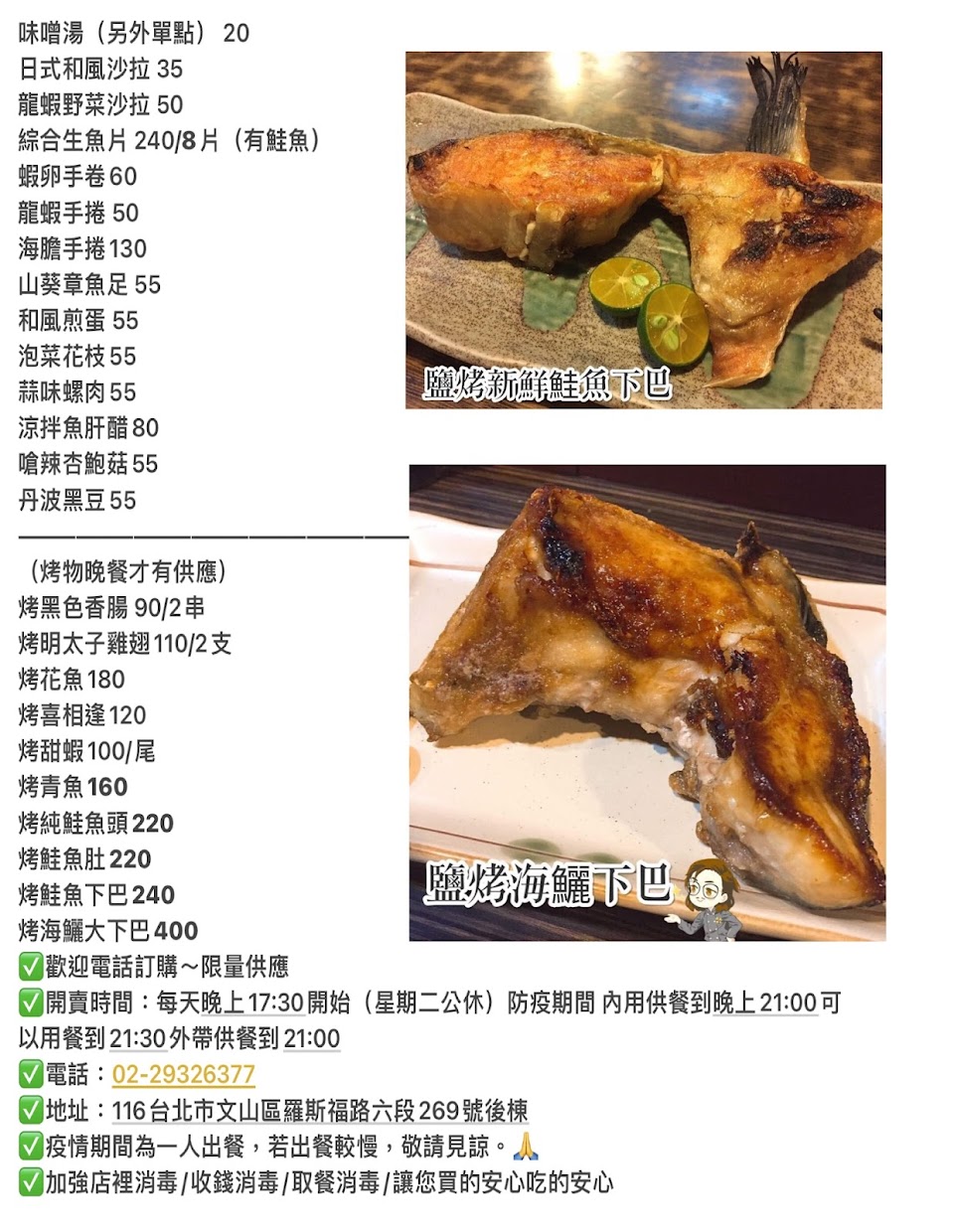 座位只有11個,不開放訂位,但現場排隊大概20分鐘就有位子(可能我們太幸運)。小菜大推山葵章魚,生魚片丼飯的CP值高但沒特別驚艷,反而鰻魚飯意外地好吃!菜單僅供參考、應該會時常異動。