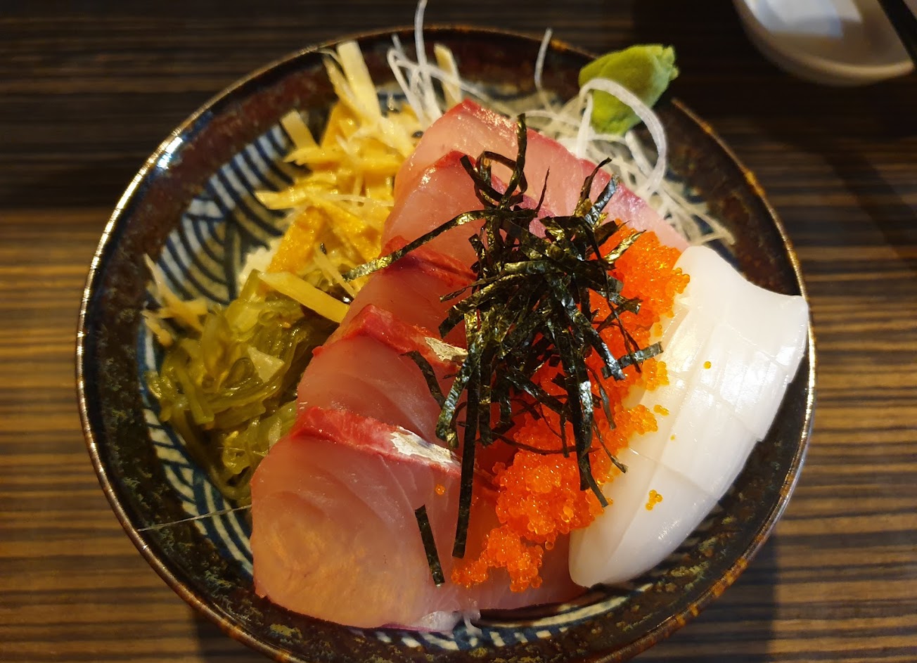 愛吃生魚片蓋飯的千萬不要錯過!多元種類還有各種價位的生魚片蓋飯,如果有選擇障礙也可以詢問師傅今天推薦什麼~魚都切得大小適中不手軟!蓋飯搭配的是冷的醋飯很好吃~幸運的話還會有特殊料理像是月見鮪魚蓋飯或是生蠔生魚飯!也有握壽司跟小菜,都很值得一試,牛肉沙拉超推!師傅還有說個小秘密,雖然秋冬天氣比較涼大家不愛吃比較涼的食物,但秋冬才是魚最好吃的時候!配上碗料多實在的便宜味噌湯就不怕冷囉~