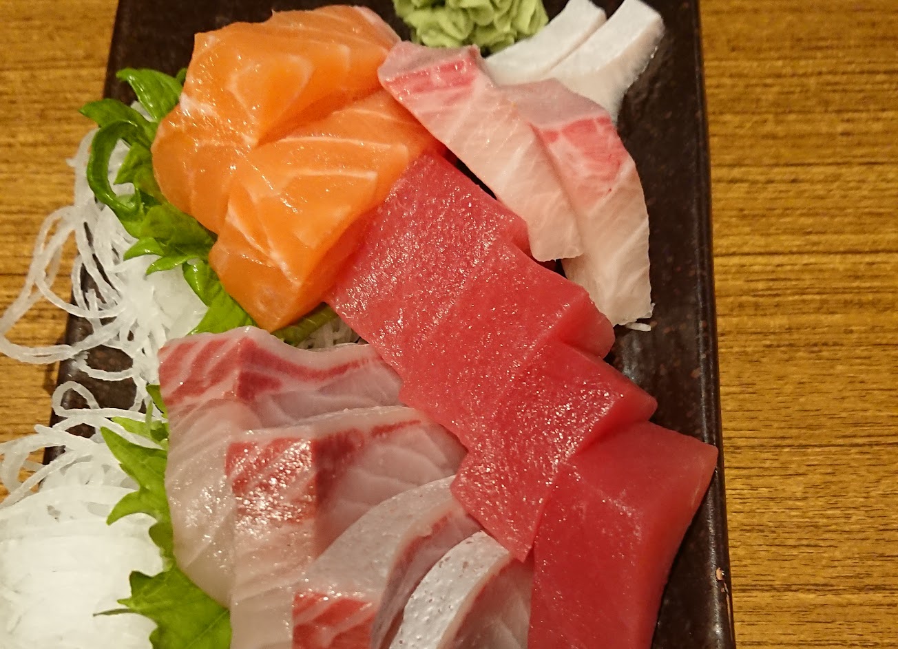 餐點選擇多樣,從生魚片到烤物、炸物、定食等等都有,不論一個人吃或是多人聚餐都有適合的選擇,無酒精飲料和酒類一樣有日本特色的選擇也非常適合聚餐。食材都很新鮮、烹調水準很高且份量十足,個人覺得是周邊區域最讓人滿意的日本料理店,尤其生魚片類的餐點非常推薦。