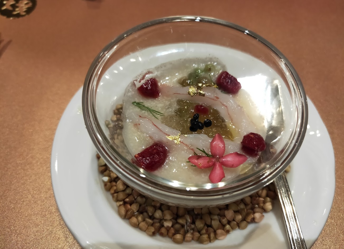 開胃菜 前菜:九孔鮑魚/洋梨/烏魚子 熱前菜:北海道空運生食干貝/澳洲大蝦/柚子胡椒蘑菇地瓜泥 手撕吐司 湯品:酥皮蘑菇湯 季節海鮮:魚? 醋飲