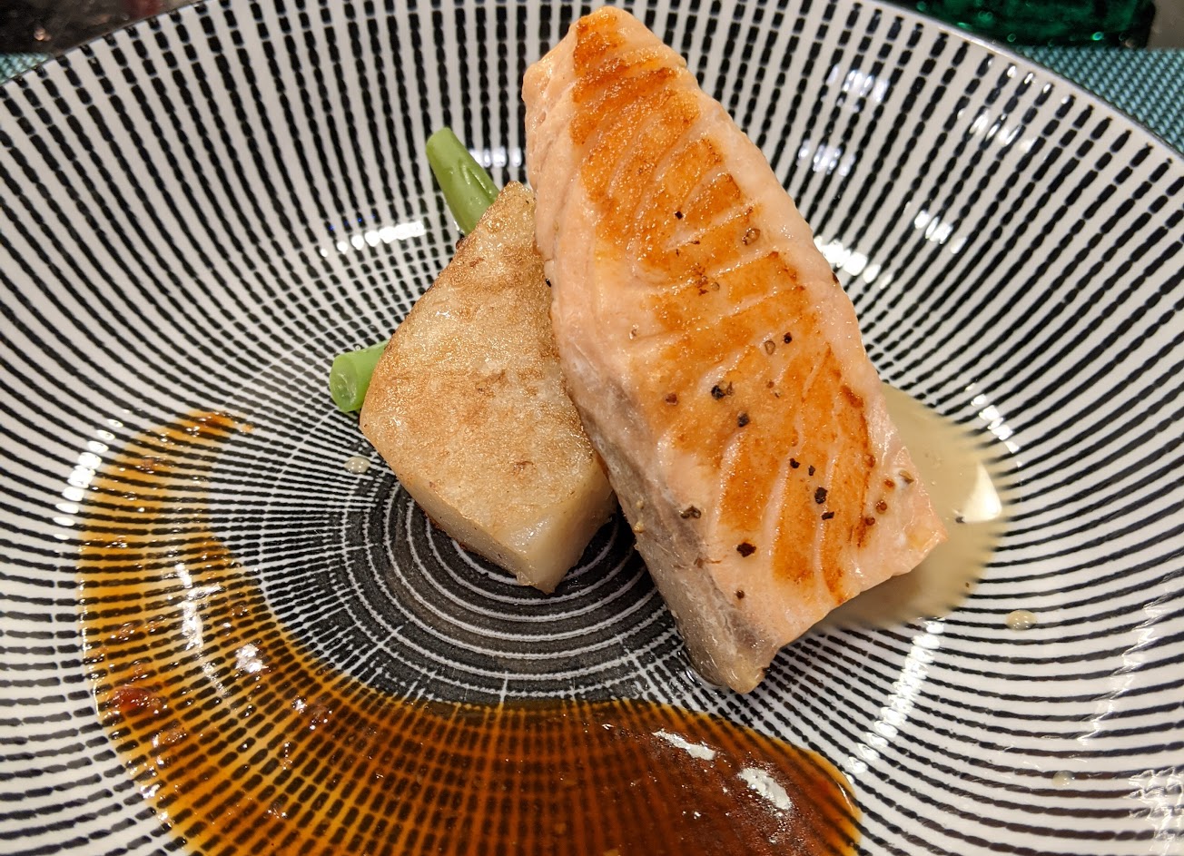 前菜的沙拉清爽、南瓜濃湯香濃好喝。當天的魚是紅條魚,魚煎得恰到好處,配上蘿蔔糕很特別。大蝦肉質彈牙、干貝則是吃得出一絲一絲又軟嫩。主餐的肉都帶點些微的焦香,櫻桃鴨胸口感比菲力牛(七分熟)還軟嫩,吃起來不柴又容易咀嚼入口,讓人非常驚豔。炒高麗菜中規中矩,櫻花蝦炒飯粒粒分明香氣十足,可惜份量比較少。最後的甜點銅鑼燒可以選擇要加紅豆麻糬或是冰淇淋,冰淇淋上面還有加上酒醋點綴。