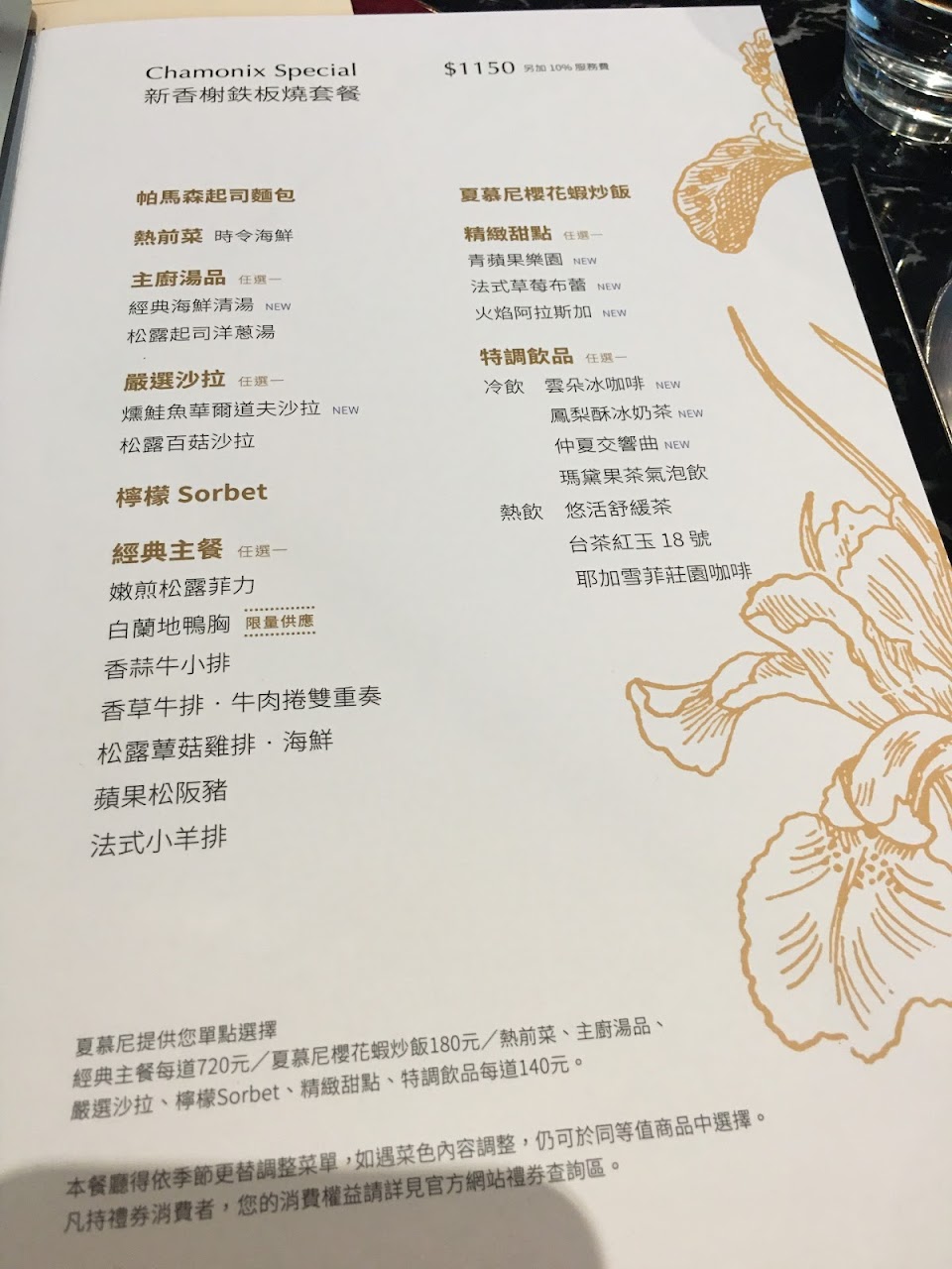 以往去用餐的時候,都是吃新香榭鐵板套餐,這次因為剛好爸爸媽媽結婚慶週年,所以來吃高一等級的夏慕尼經典套餐 ?