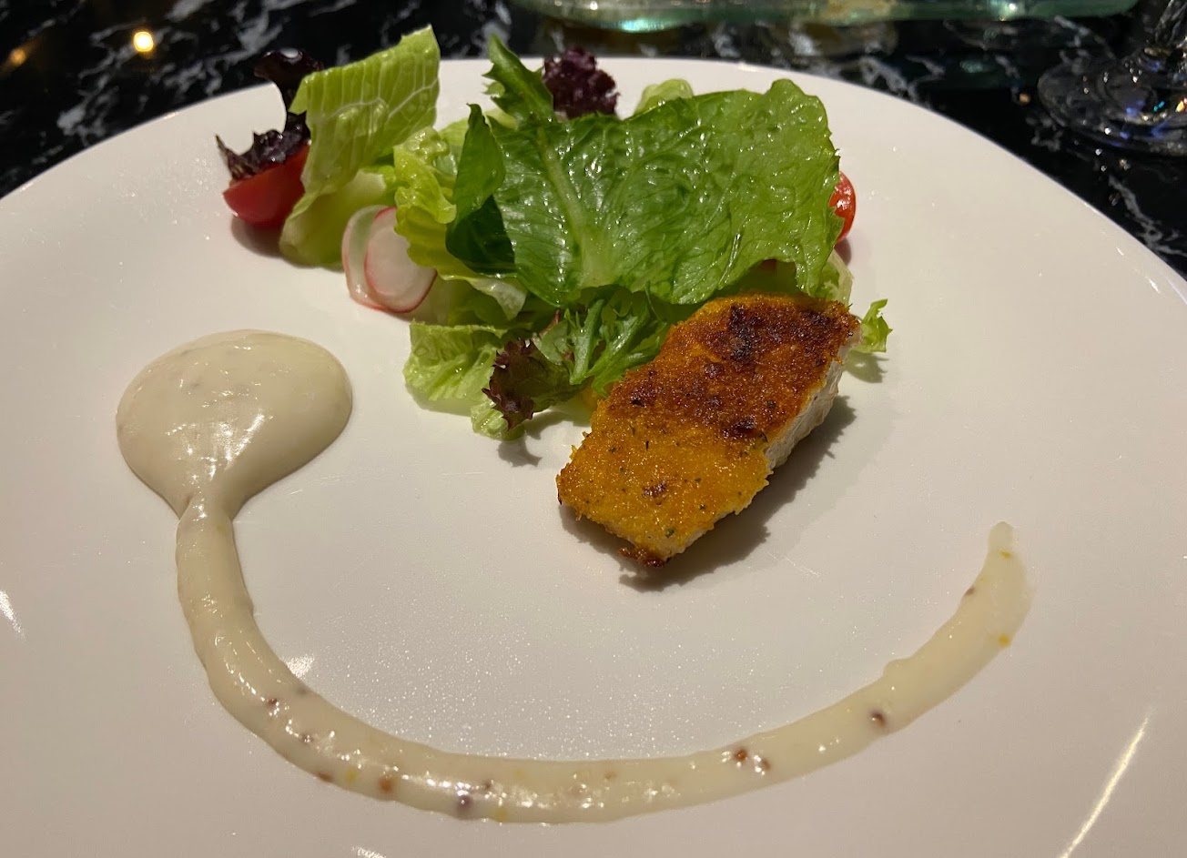 ?凱薩鮮魚溫沙拉:魚肉煎到外皮酥脆,稍微帶有一些起司香氣。