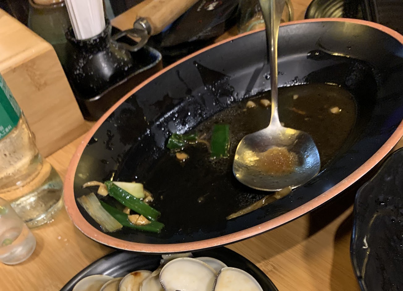 黑蒜頭湯滿好喝的。爆炒牛肉、蝦手卷、明太子雞翅、清蒸鱸魚也不錯