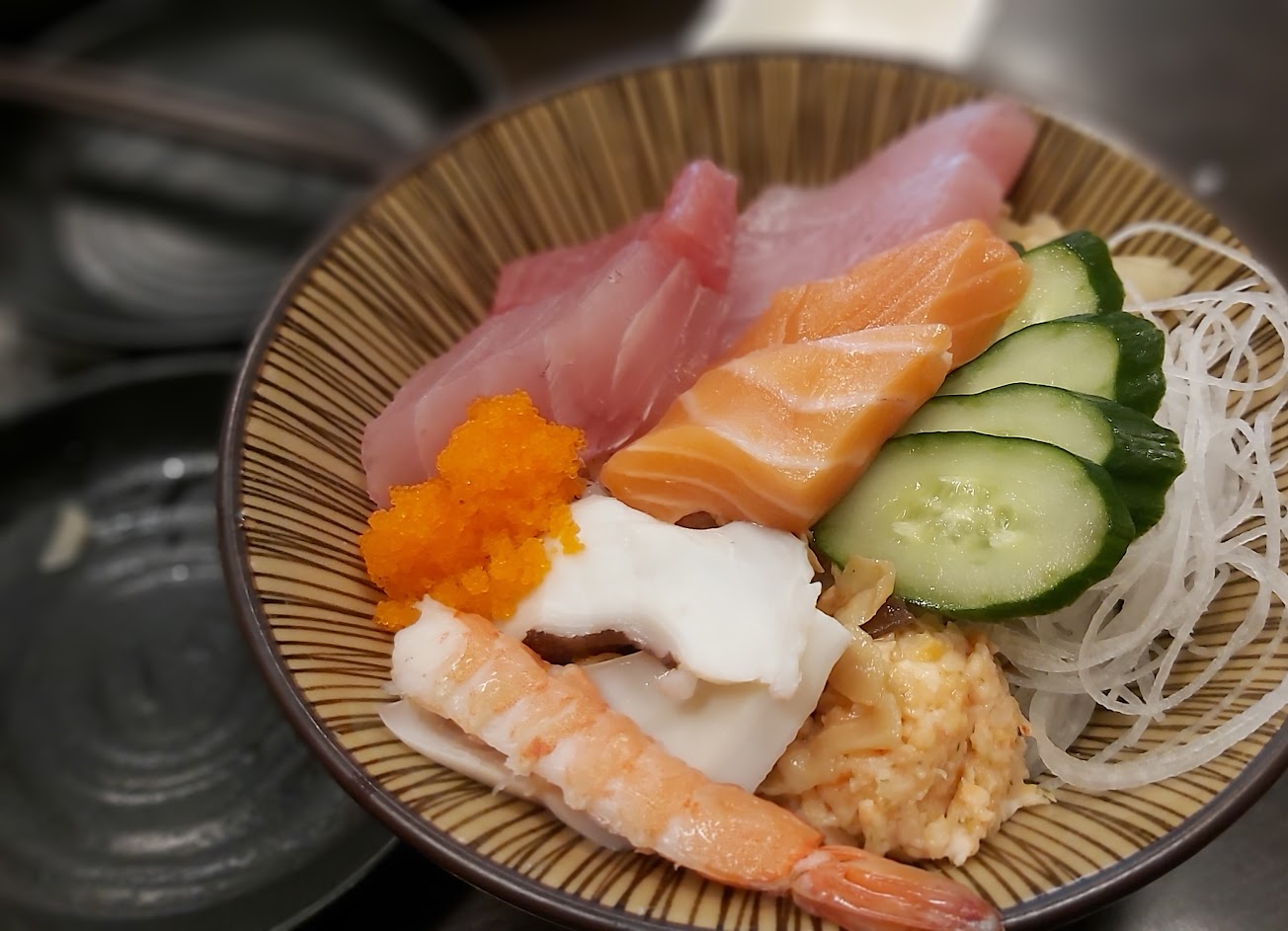 生魚丼200元-有三種魚、章魚腳、醃貝唇、鮮蝦、蟹肉沙拉、蝦卵、香鬆醋飯,經濟實惠