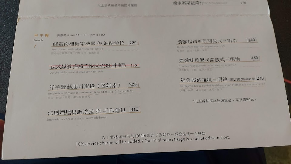 這家之前常訂它的千層蛋糕,很好吃。今天第一次嘗試早午餐。現場員工只有一個,有分身乏術的感覺(但態度有禮貌),之後十點才陸續來了兩個服務人員。飲料奶茶跟玄米是茶包,覺得失望。洋芋蛋捲餐和庫克太太三明治雖然口味不差,但量很少,沒有飽足感,價位卻要200元以上。相較於他的千層蛋糕而言,比較不推它的早午餐。