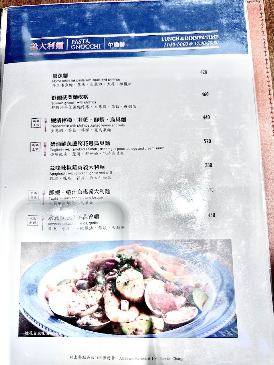 價位偏高,但是食物真的美味。推薦雞腿肉酸果沙拉,肉質軟嫩、而且上菜時肉的溫度剛好,外皮也煎得香脆,非常好吃!手工墨魚麵也令人驚艷,不像一般直麵條,稍微有點捲曲的麵,更容易吸附醬汁,搭配新鮮的蝦子和小卷,回味無窮。