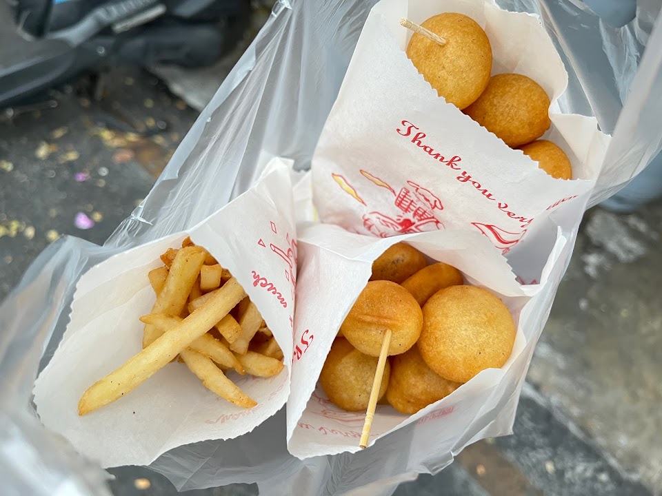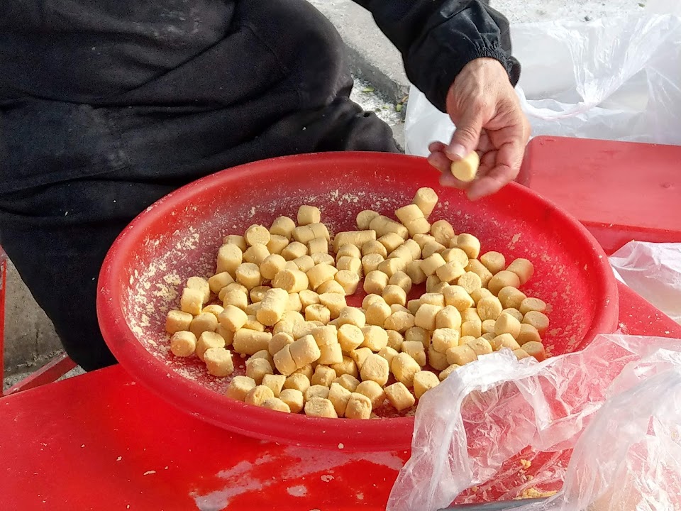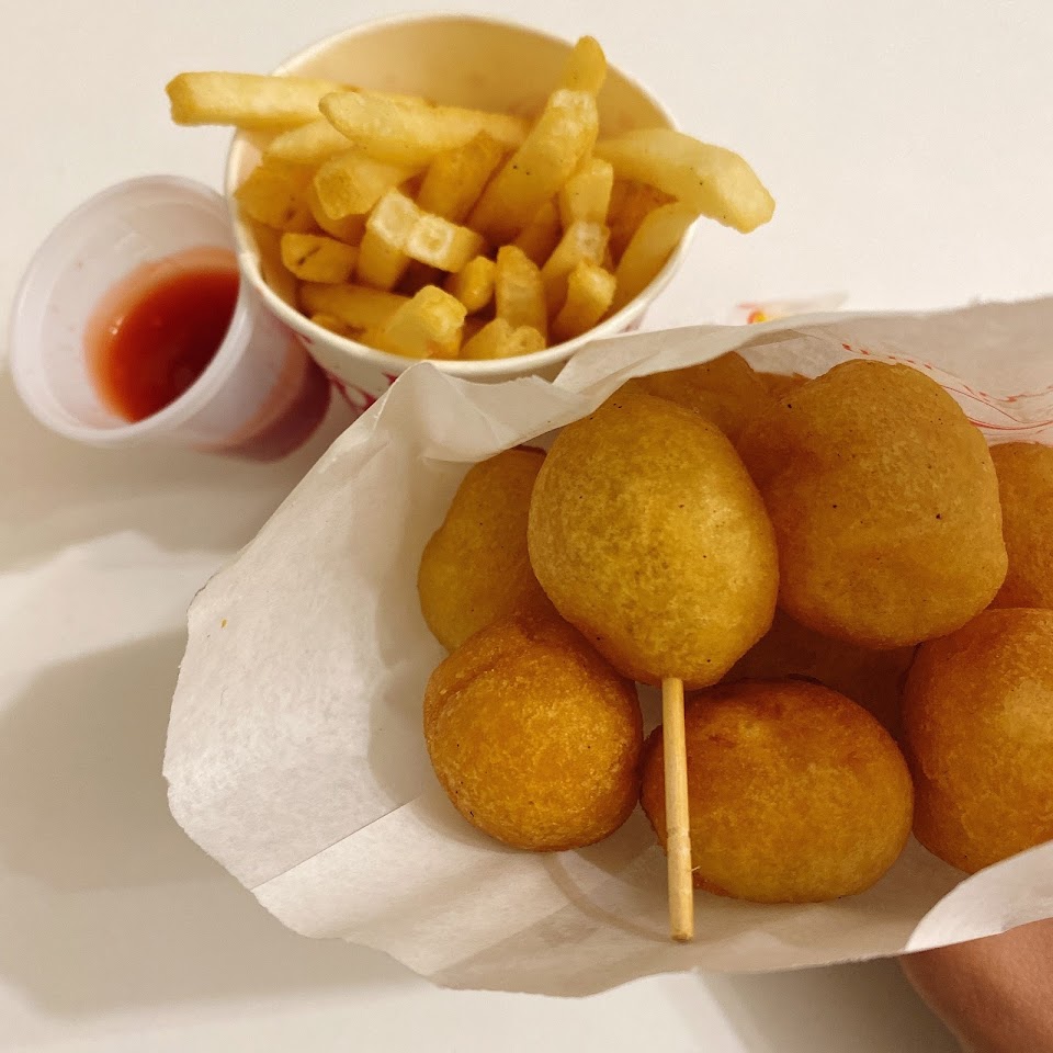 勞工公園旁的點心外帶店,主要商品是一粒1元的QQ球,口感Q軟有嚼勁、有越嚼越香的番薯甜,薯條較為普通,整體經濟實惠,假日來逛花市的散步小點心。