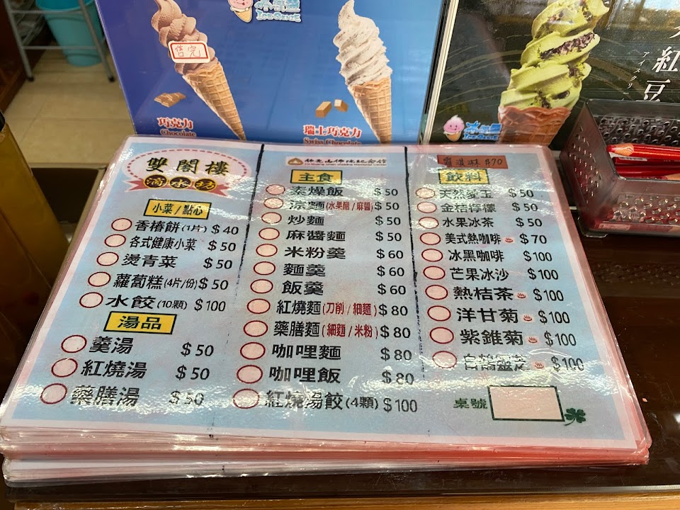 一樓有紅燒麵,米粉羹,水餃,炒飯等。各類小菜和愛玉冰。