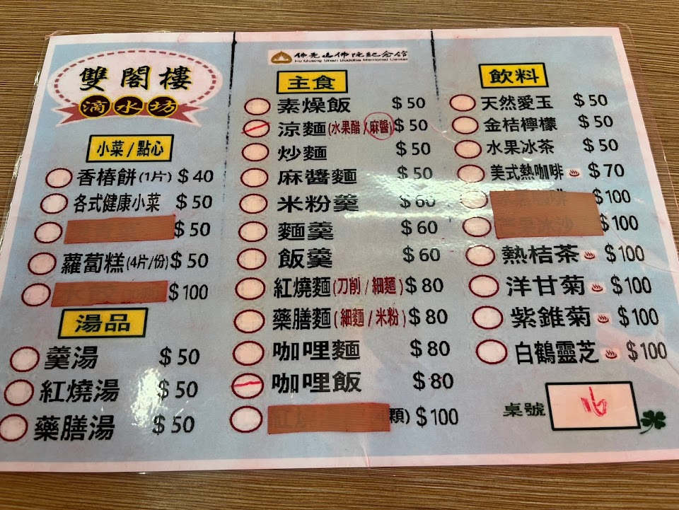 雙閣樓是山上其中一間的滴水坊位於佛陀紀念館內右側走廊外頭的地方,比較偏遠較少人知道,一樣都是山上師父自行料理販賣,價位每份五十起,份量蠻大的,主打用蕃茄熬煮的紅燒麵,麵體是刀削烏龍麵,其他咖哩飯、炒麵、水餃、羹麵羹飯、蘿蔔糕、香椿抓餅樣式很多,也有手洗的金佶愛玉是今天的滿分!也有各式小菜一盤50,雖然沒美味但是有點貴。