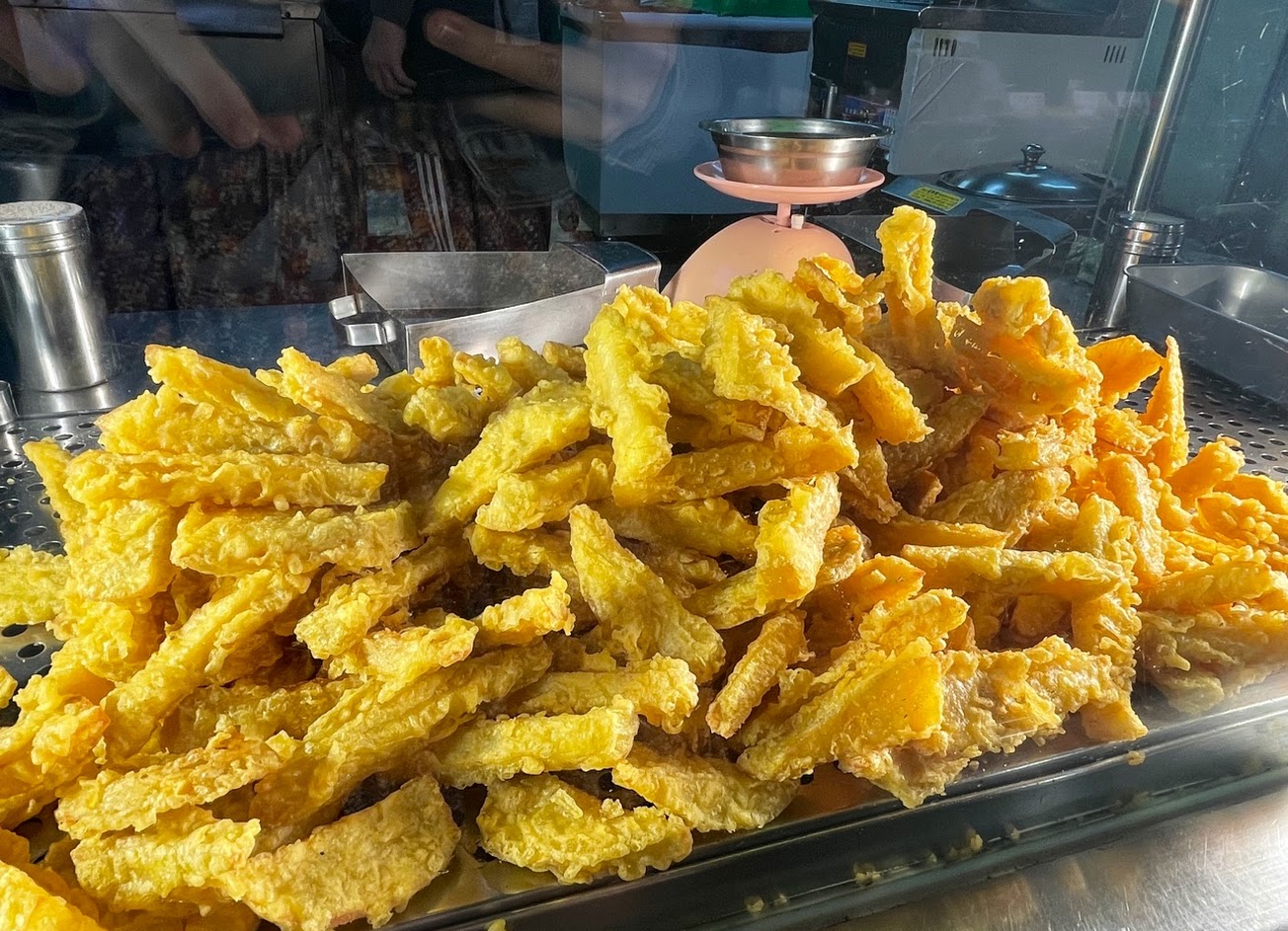麵衣變厚、炸得過硬,地瓜肉量變薄變少,60元給不到幾條⋯⋯很扯!